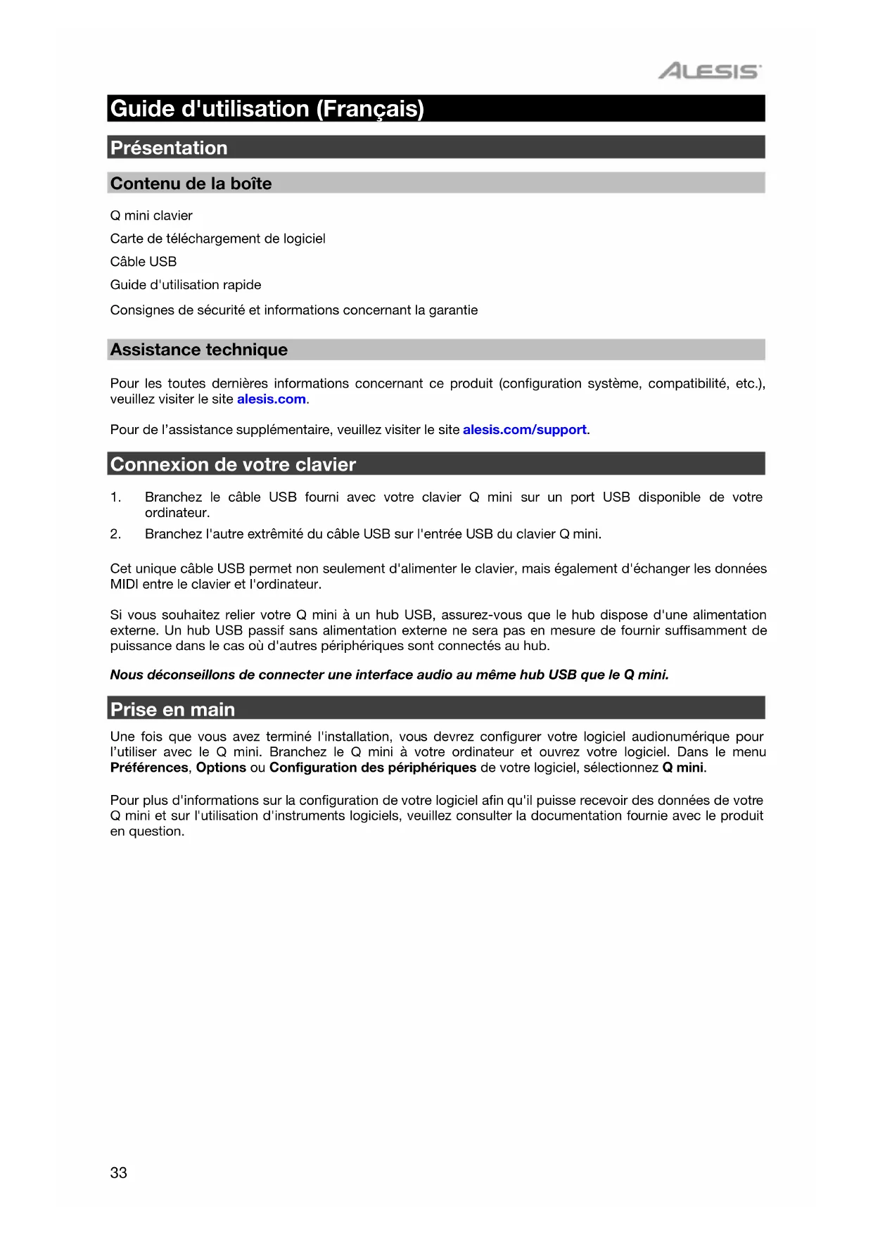 - Essayez d'utiliser un câble USB différent. J'ai branché le Q mini sur mon ordinateur mais les LED du clavier ne s'allument pas. Les ports USB ne sont pas tous en mesure de délivrer assez de puissance pour alimenter un périphérique tel que le Q mini. Essayez de brancher votre clavier sur un autre port USB pour tenter de résoudre le problème. Vous pouvez également connecter un hub USB alimenté à votre ordinateur, puis brancher votre Q mini sur le hub. Lorsque j'appuie sur une touche, j'entends la note avec un certain retard. Ce retard, qui se produit plus souvent sur les systèmes Windows, est appelé la latence. Ce problème est dû au temps que met votre logiciel d'enregistrement pour recevoir et traiter les données MIDI transmises par votre Q mini, puis pour renvoyer le signal audio résultant à votre interface audio ou carte son et enfin à vos haut-parleurs ou votre casque. Pour réduire la quantité de latence, vous devez sélectionner un autre pilote à partir des choix disponibles dans la fenêtre des préférences audio (ou options audio) de votre logiciel. Si vous ne savez pas comment accéder aux préférences audio, reportez-vous à la documentation fournie avec votre logiciel pour obtenir plus d'informations sur la procédure à suivre. La capture d'écran suivante est un exemple des différents paramètres que vous êtes susceptible de trouver dans les préférences audio de votre logiciel. Cependant, nous vous conseillons de vous référer au guide de l'utilisateur de votre application, l'organisation de ces paramètres ou la fenêtre pouvant être différentes. En regardant cette fenêtre, vous pouvez constater que le pilote actuellement utilisé par votre logiciel apparaît dans l'une des sections et la quantité de latence associée apparaît dans une autre. Si vous rencontrez toujours des problèmes de latence, vous pouvez accéder à d'autres informations de dépannage sur notresite Web : alesis.com/support.50 Guida per l'uso (Italiano) Introduzione Contenuti della confezione Q mini Scheda per il download del software Cavo USB Guida rapida Istruzioni di sicurezza e garanzia Assistenza Per le ultime informazioni in merito a questo prodotto (requisiti di sistema, informazioni sulla compatibilità, ecc.) e per effettuarne la registrazione, recarsi alla pagina alesis.com. Per ulteriore supporto sul prodotto, visitare, recarsi alla pagina alesis.com/support. Collegamento della tastiera