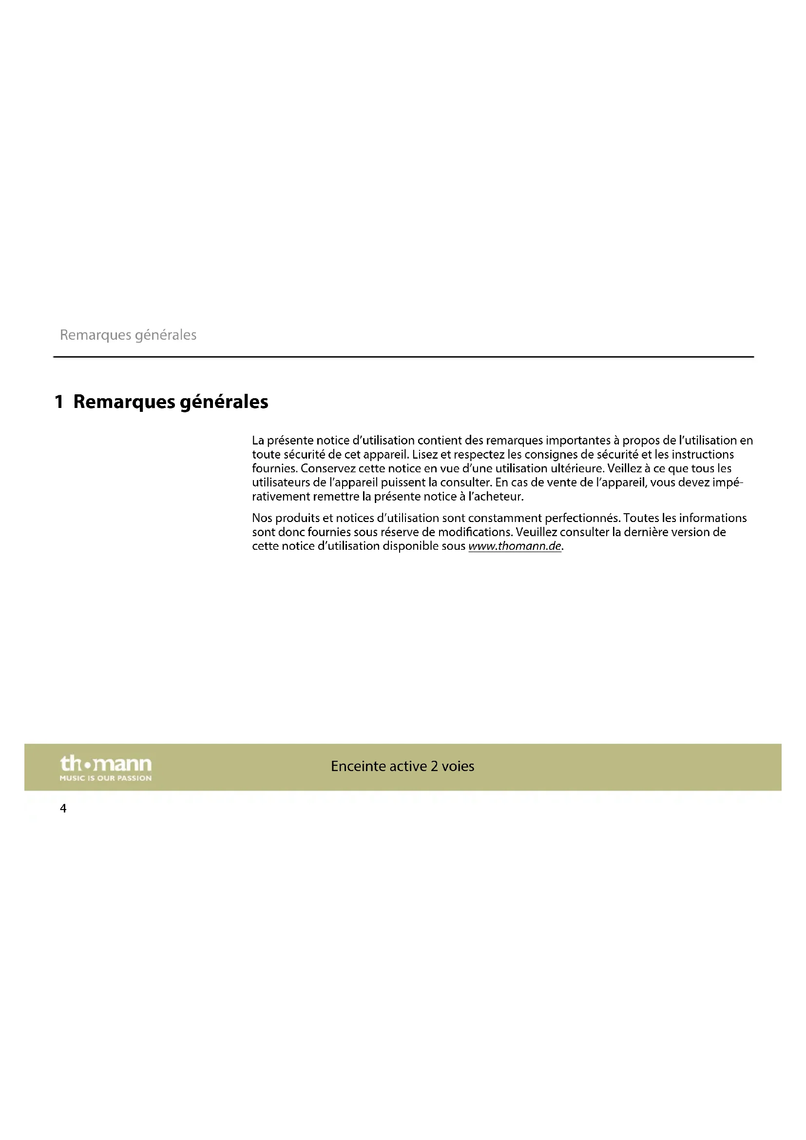 MBA1 31 Remarques générales La présente notice d’utilisation contient des remarques importantes à propos de l’utilisation en toute sécurité de cet appareil. Lisez et respectez les consignes de sécurité et les instructions fournies. Conservez cette notice en vue d’une utilisation ultérieure. Veillez à ce que tous les utilisateurs de l’appareil puissent la consulter. En cas de vente de l’appareil, vous devez impé‐ rativement remettre la présente notice à l’acheteur. Nos produits et notices d’utilisation sont constamment perfectionnés. Toutes les informations sont donc fournies sous réserve de modications. Veuillez consulter la dernière version de cette notice d’utilisation disponible sous www.thomann.de. Remarques générales