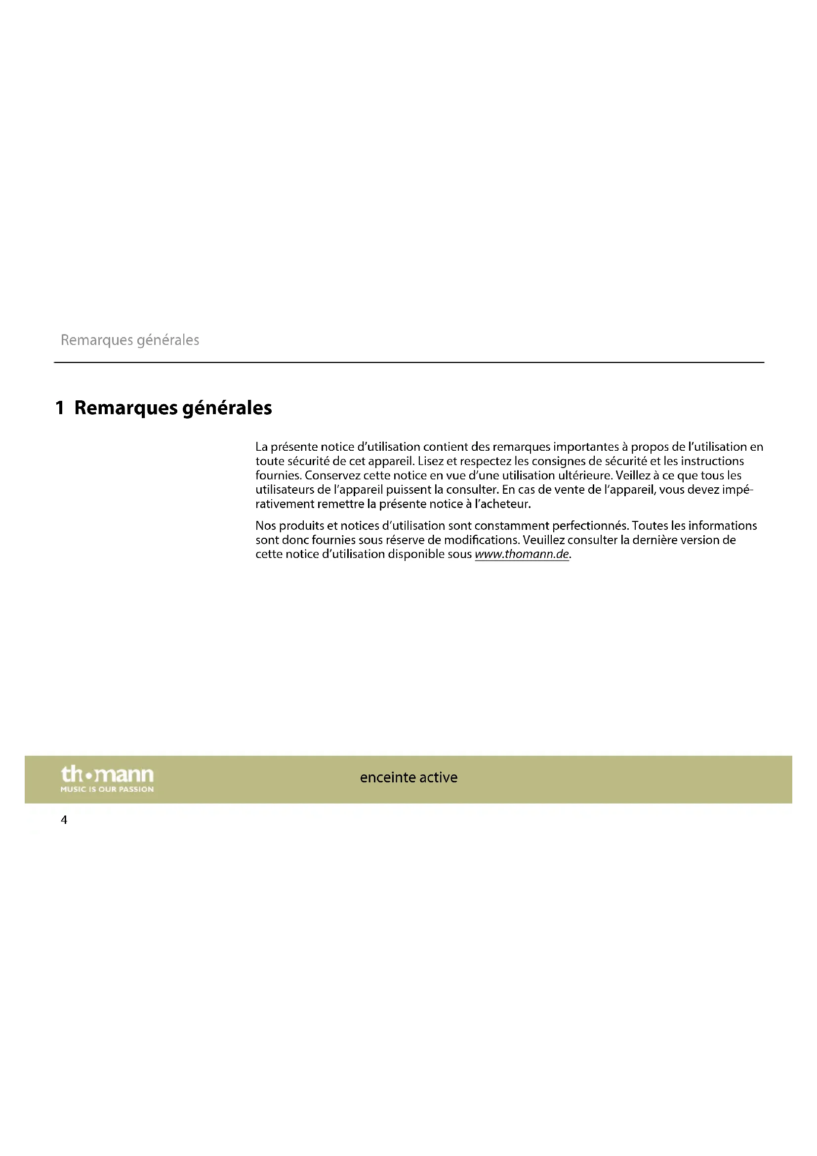 Achat 104 A 31 Remarques générales La présente notice d’utilisation contient des remarques importantes à propos de l’utilisation en toute sécurité de cet appareil. Lisez et respectez les consignes de sécurité et les instructions fournies. Conservez cette notice en vue d’une utilisation ultérieure. Veillez à ce que tous les utilisateurs de l’appareil puissent la consulter. En cas de vente de l’appareil, vous devez impé‐ rativement remettre la présente notice à l’acheteur. Nos produits et notices d’utilisation sont constamment perfectionnés. Toutes les informations sont donc fournies sous réserve de modications. Veuillez consulter la dernière version de cette notice d’utilisation disponible sous www.thomann.de. Remarques générales