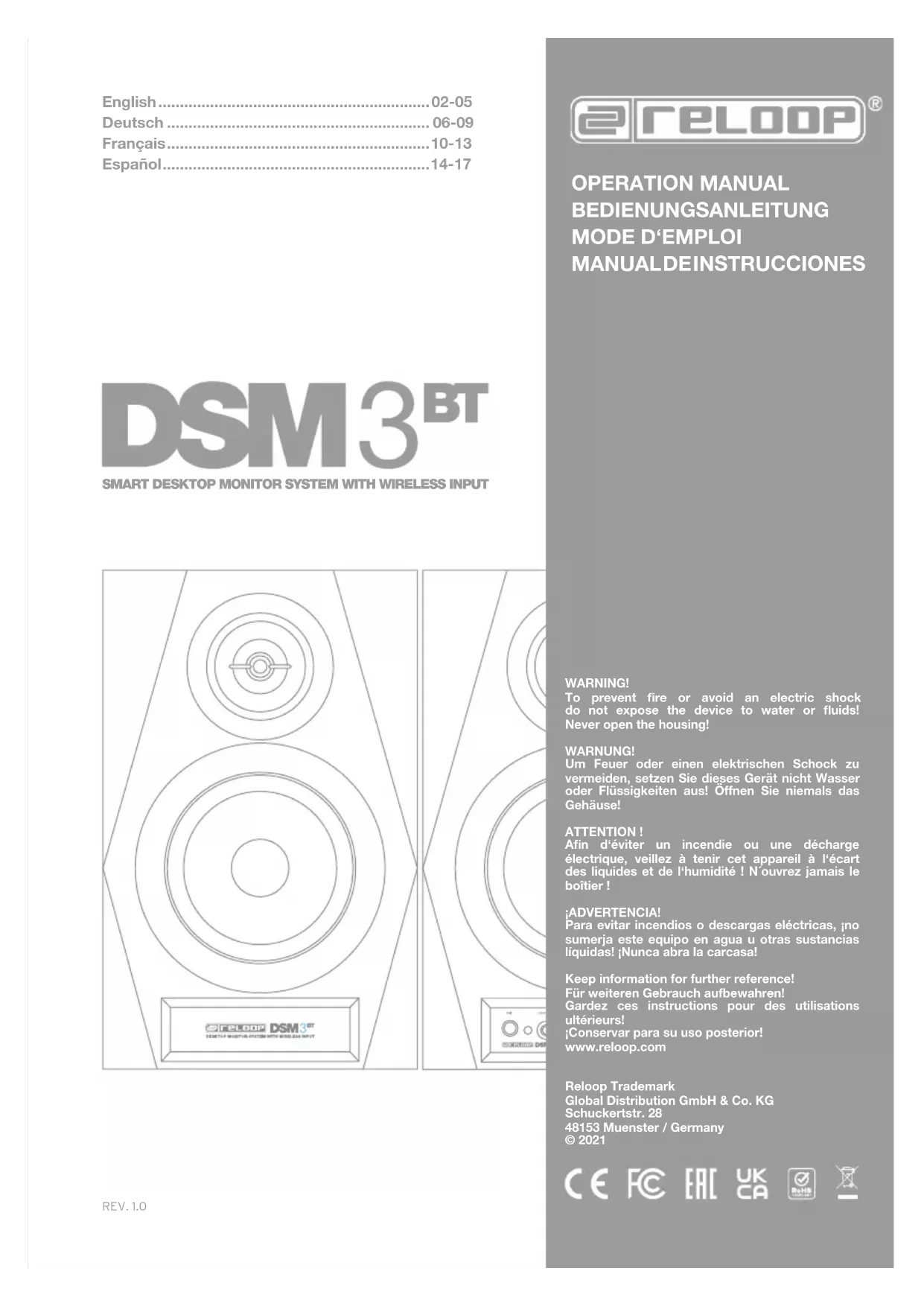 vorgesehenen Klemmen -1- / -6-. Führen Sie die Kerndrähte in die Buchsen ein, indem Sie auf die Klemme an der Lautsprecherbuchse drücken. DEUTSCH DEUTSCH1110 ATTENTION ! Pour votre propre sécurité, veuillez lire attentivement ce mode d’emploi avant la première utilisation ! Toutes les personnes chargées de l’installation, de la mise en service, de l’utilisation, de l’entretien et la maintenance de cet appareil doivent posséder les qualications nécessaires et respecter les instructions de ce mode d’emploi. Ce produit est conforme aux directives européennes et nationales, la conformité a été certiée et les déclarations et documents sont en possession du fabricant. Retirez la Reloop DSM-3 BT de son emballage. Avant la première mise en service, vériez le bon état de l’appareil. Si le boîtier ou le câble sont endommagés, n’utilisez pas l’appareil et contactez votre revendeur.