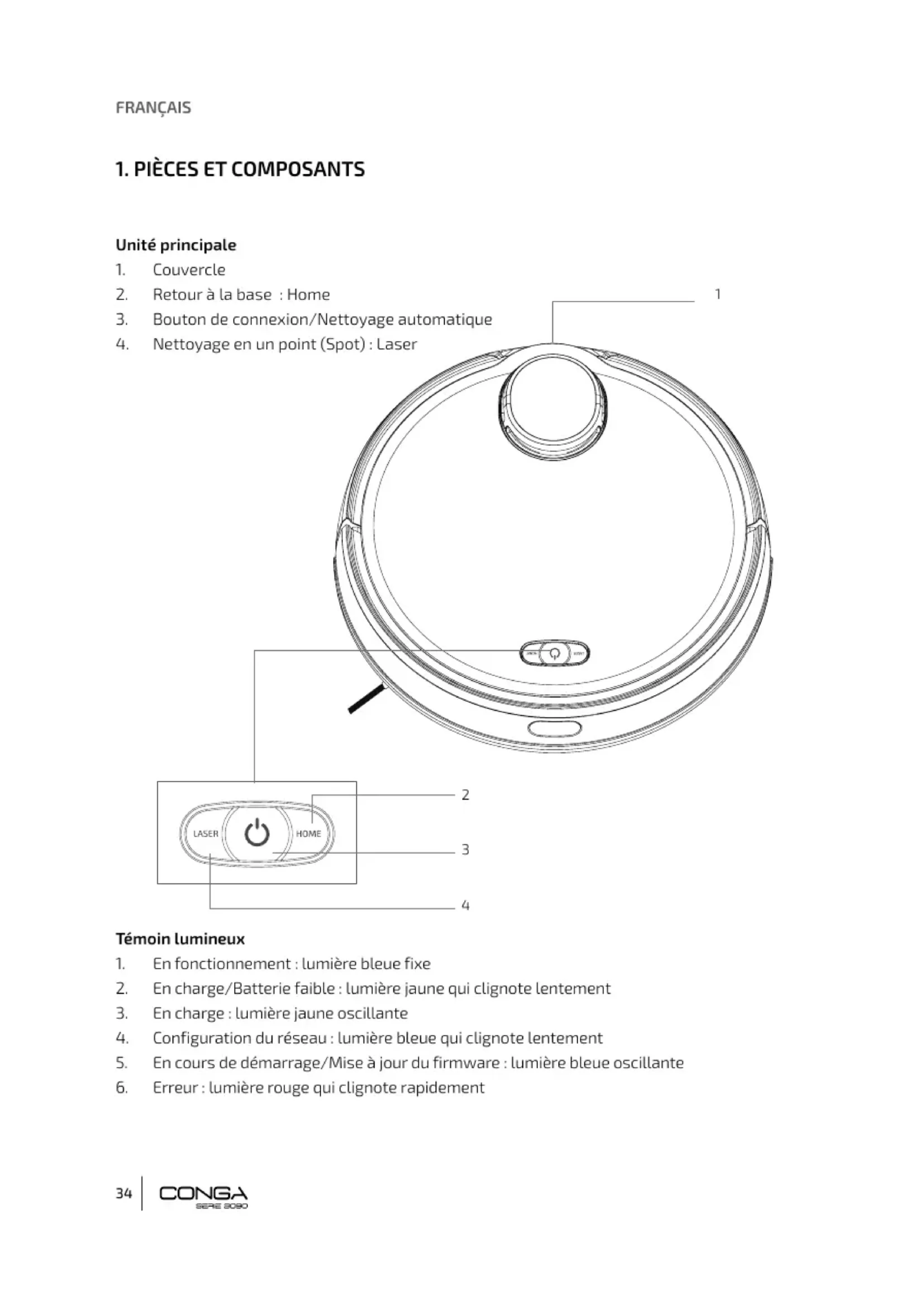 - Le robot ne peut être éteint lorsqu’il est en charge. Lumière bleue fixe : ON/En fonctionnement. Lumière jaune oscillante : en charge. Lumière rouge clignotante : erreur. Enroulez et rangez le câble restant au niveau de la partie inférieure de la base de charge.FRANÇAIS