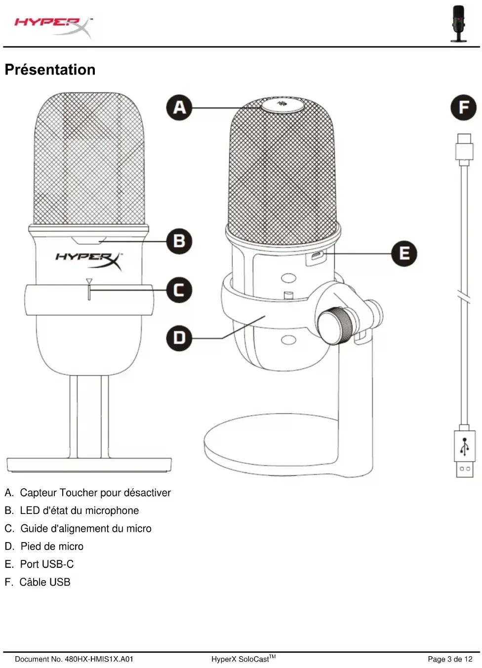 Présentation A. Capteur Toucher pour désactiver B. LED d'état du microphone C. Guide d'alignement du micro D. Pied de micro E. Port USB-C F. Câble USBDocument No. 480HX-HMIS1X.A01 HyperX SoloCast
