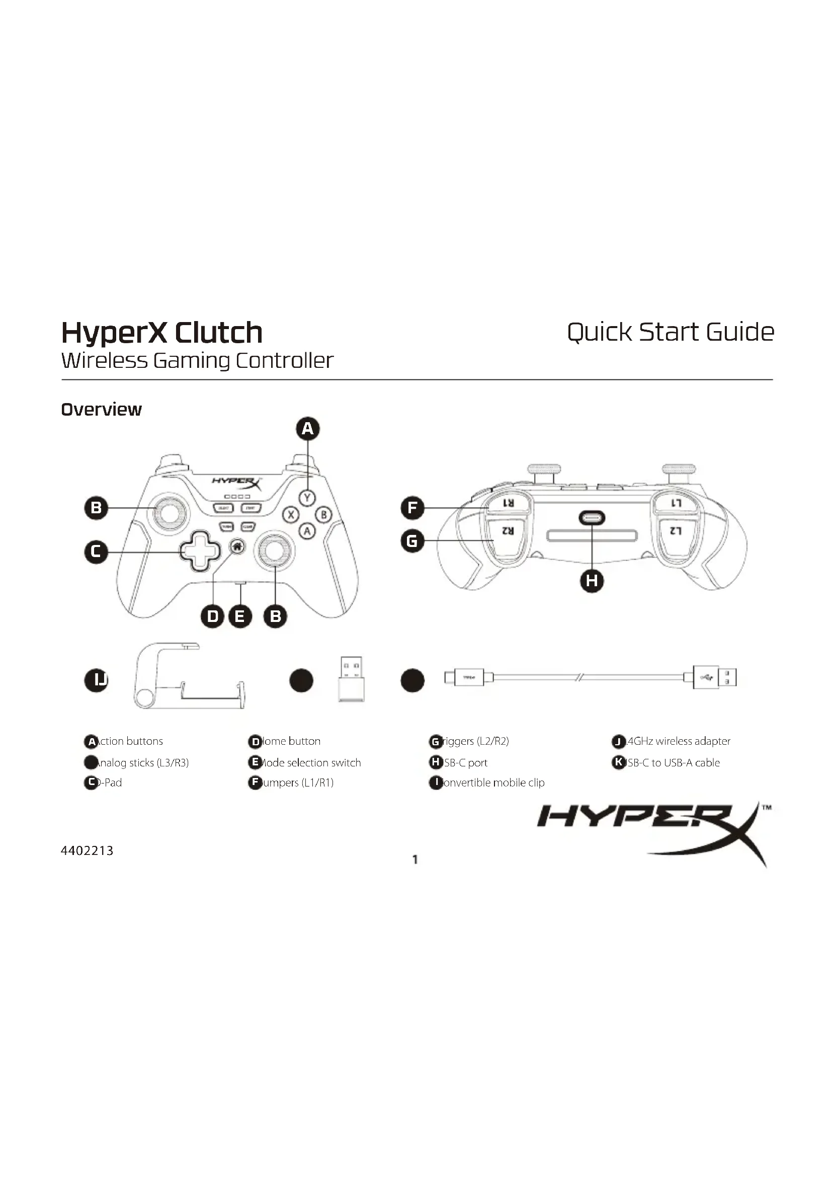Clutch ».UtilisationAlimentation - mode 2,4G ou Bluetooth Appuyez sur le bouton Home pour mettre la manette sous tension. La manette lance la connexion avec votre appareil. La manette s'éteint automatiquement après 5 minutes d'inactivité.Mode ManuelFixez le clip mobile et insérez un téléphone.Mode TablePliez le clip pour l'utiliser comme support de téléphone ou de tablette.Questions ou problèmes de conguration ?d'utilisation sur : Contactez l'équipe d'assistance HyperX:http://www.hyperxgaming.com/supportITALIANODescrizione generale del prodottoA - Pulsanti di azioneB - Stick analogici (L3/R3)C - D-PadD - Pulsante Home E - Interruttore selezione modalità F - Bumper (L1/R1)G - Trigger (L2/R2)H - Porta USB-CI - Clip mobile convertibileJ - Adattatore wireless da 2,4GHz K - Cavo adattatore da USB-C a USB-A CongurazioneIn caricaIn occasione del primo utilizzo, si consiglia di eettuare un ciclo di ricarica completo del controller. Scelta modalitàConnessione e accoppiamento2,4 G1. Impostare l'interruttore di scelta della modalità su 2,4 G.2. Connettere l'adattatore wireless da 2,4 GHz al PC.3. Premere il pulsante Home. Il controller si accenderà e proverà a connettersi all'adattatore wireless da 2,4 GHz.Bluetooth1. Impostare l'interruttore di scelta della modalità su Bluetooth. 2. Tenere premuto per 6 secondi il pulsante Home no a quando il LED indica l'avvio della modalità di accoppiamento.3. Sul dispositivo compatibile con Bluetooth, individuare "HyperX Clutch" e avviare la connessioneIstruzioni d'usoAlimentazione - Modalità Bluetooth o 2,4 GPremere il pulsante Home per attivare il controller. Il controller proverà a stabilire la connessione al dispositivo. Il controller si disattiverà automaticamente dopo 5 minuti di inattività.Modalità portatileCollegare la clip mobile e inserire il telefono.Modalità da tavoloRipiegare la clip per l'uso come base per telefono tablet.Domande o dubbi sulla congurazione?Contattare il team di supporto HyperX all'indirizzo: http://www.hyperxgaming.com/supportDEUTSCHÜbersichtA - AktionstastenB - Analog-Sticks (L3/R3)C - D-PadD - Home-TasteE - ModuswahlschalterF - Bumper (L1/R1)G - Trigger (L2/R2)H - USB-C-AnschlussI - Verstellbare MobiltelefonhalterungJ - 2.4GHz-FunkadapterK - USB-C-zu-A-KabelEinrichtenLadenEs wird empfohlen, den Controller vor der ersten Verwendung vollständig zu laden. ModusauswahlKoppeln und Verbinden 2.4G 1. Stelle den Moduswahlschalter auf 2.4G.2. Verbinde den 2,4GHz-Funkadapter mit dem PC.3. Tippe auf die Home-Taste. Der Controller schaltet sich ein und versucht, eine Verbindung mit dem 2,4GHz-Funkadapter herzustellen.Bluetooth