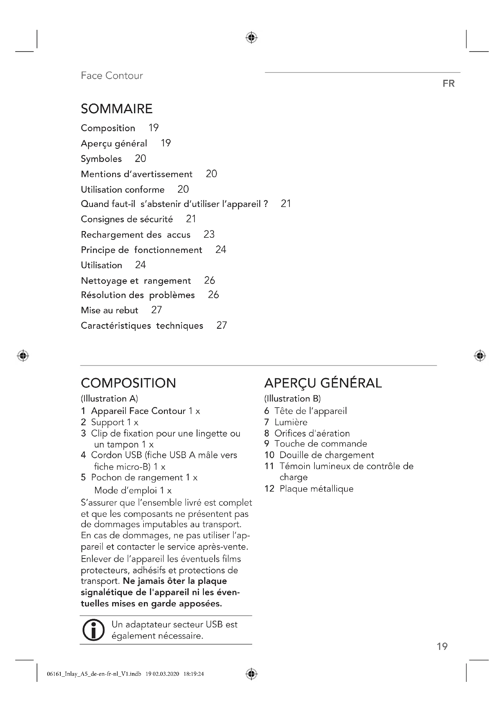 1 Appareil Face Contour 1 x 2 Support 1 x 3 Clip de fixation pour une lingette ou un tampon 1 x 4 Cordon USB (fiche USB A mâle vers fiche micro-B) 1 x 5 Pochon de rangement 1 x Mode d'emploi 1 x