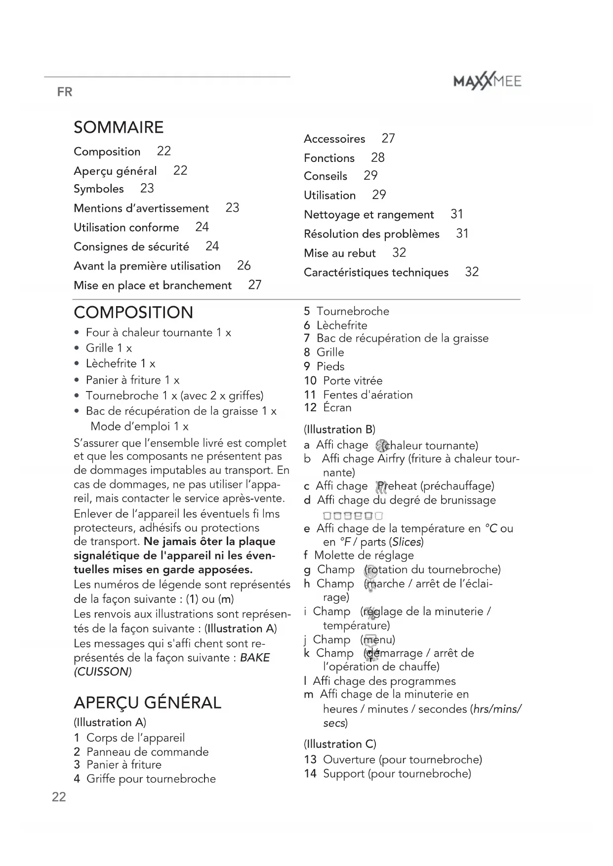 (IllustrationA) 1 Corps de l’appareil 2 Panneau de commande 3 Panier à friture 4 Griffe pour tournebroche 5 Tournebroche 6 Lèchefrite 7 Bac de récupération de la graisse 8 Grille 9 Pieds 10 Porte vitrée 11 Fentes d'aération 12 Écran (IllustrationB) a Affi chage (chaleur tournante) b Affi chage Airfry (friture à chaleur tour- nante) c Affi chage Preheat (préchauffage) d Affi chage du degré de brunissage e Affi chage de la température en °C ou en °F / parts (Slices) f Molette de réglage g Champ (rotation du tournebroche) h Champ (marche/ arrêt de l’éclai- rage) i Champ (réglage de la minuterie / température) j Champ (menu) k Champ (démarrage/ arrêt de l’opération de chauffe) l Affi chage des programmes m Affi chage de la minuterie en heures / minutes / secondes (hrs/mins/ secs) (IllustrationC) 13 Ouverture (pour tournebroche) 14 Support (pour tournebroche)Four à chaleur tournante numérique