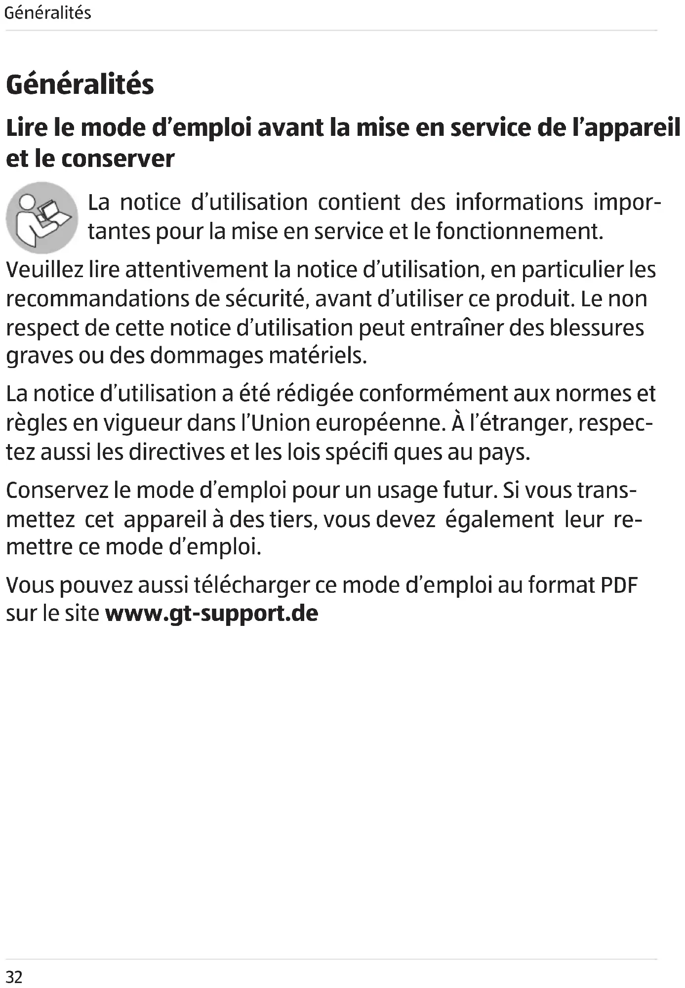 - Lire le mode d’emploi avant la mise en service de l’appareil et le conserver p. 32