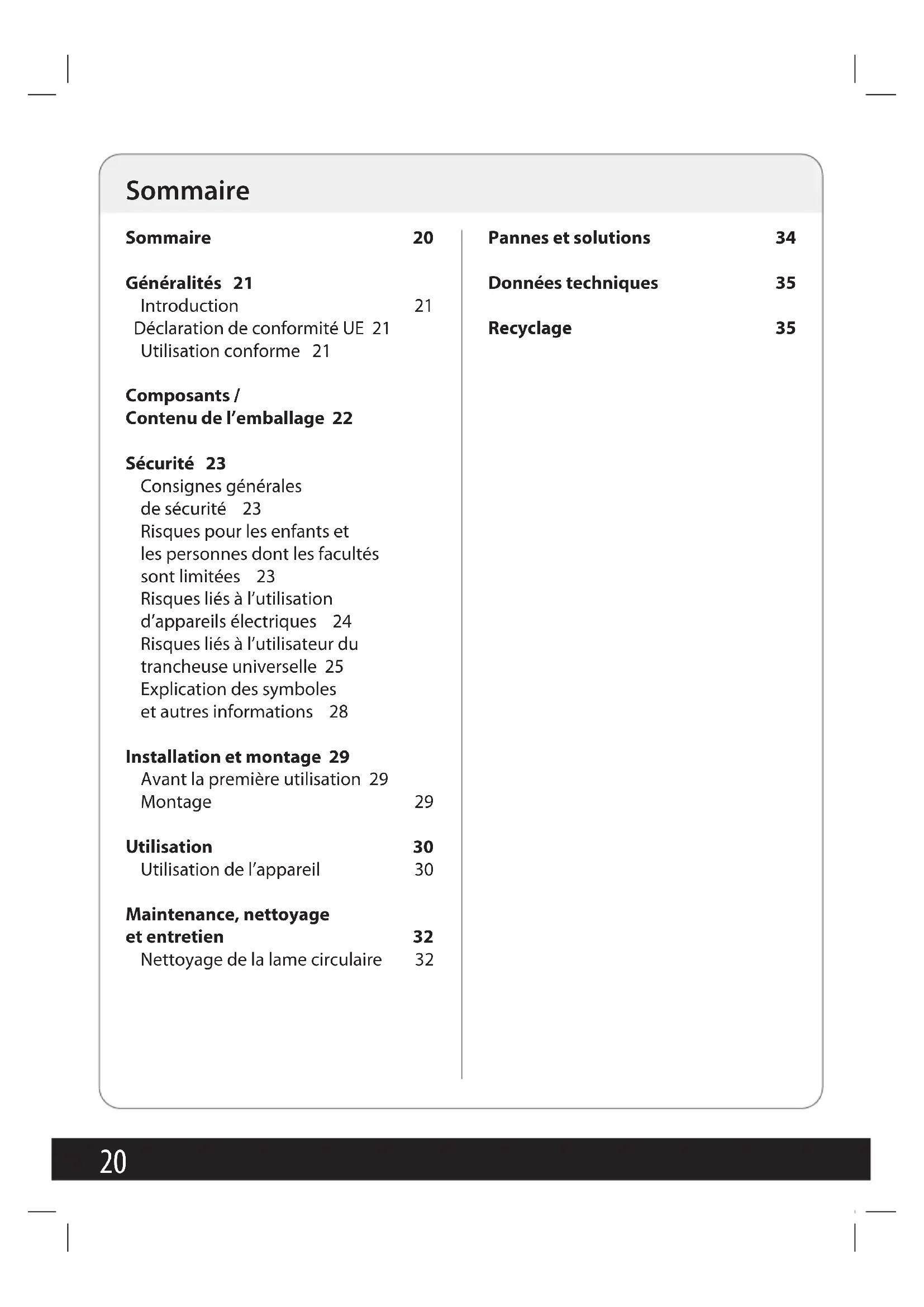 Composants/ Contenudel’emballage23 Sécurité Veuillez lire et respecter les consignes de sécu- rité énoncées ci-après. Le non-respect de ces consignes peut en- gendrer des risques d’accident et de bles- sures, ainsi que des dommages matériels ou des dysfonctionne- ments de l’appareil. Consignes générales de sécurité Risques pour les enfants et les personnes dont les facul- tés sont limitées - Les personnes dont les facultés physiques, senso- rielles ou mentales sont réduites ou les personnes manquant d’expérience et/ou de connaissances sont autorisées à utiliser cet appareil, à condi- tion d’être surveillées ou d’avoir été instruites quant à son usage sûr et d’avoir compris les dangers résultant d’une utilisation incorrecte. - Les enfants ne doivent pas procéder au nettoyage et à l’entretien de l’appareil. - Cet appareil ne peut pas être utilisé par les enfants. Conservez cet appareil et son câble électrique hors de portée des enfants. - Les enfants ne doivent pas jouer avec l’appareil. Les enfants ne sont pas conscients du danger inhérent à l’utilisation d’appareils électriques. Par conséquent, utilisez et conservez l’appareil hors de portée de ces derniers. Ne laissez pas pendre le cordon élec- trique afin d’éviter que quelqu’un ne tire dessus. - Conservez l’emballage hors de portée des enfants – Risque d’asphyxie!24 Risques liés à l’utilisation d’appareils électriques - Branchez l’appareil uniquement sur une prise secteur, installée de manière conforme et dont la tension de secteur respecte la plaque signalétique. - Si le cordon d’alimenta- tion de cet appareil est endommagé, il doit être remplacé par le fabricant, le SAV de ce dernier ou toute personne suffisam- ment qualifiée, afin d’évi- ter toute mise en danger. - Seuls des ateliers spéciali- sés et habilités sont auto- risés à effectuer les répara- tions. Les appareils réparés par un personnel non spécialisé représentent un danger pour l’utilisateur. - Éteignez toujours l’appa- reil et débranchez-le lorsque vous le laissez sans surveillance, lorsque vous montez ou retirez les accessoires, ou avant de le nettoyer. Pour débrancher, tirez toujours au niveau de la fiche et non au niveau du cordon ! – Risque d’électrocution ! - Afin d’éviter tout acci- dent, n’utilisez jamais la même prise secteur avec terre pour brancher simultanément plusieurs appareils ménagers (par exemple sur une triplite). - Ne plongez jamais l’ap- pareil dans l’eau et ne l’utilisez pas en plein air, car ce dernier ne doit en aucun cas être exposé à la pluie ou à l’humidité – Risque d’électrocution! - Si l’appareil venait à tom- ber dans l’eau, débranchez d’abord la prise avant de le sortir de l’eau ! Ne remettez pas l’appareil en service avant de l’avoir fait contrôler par un SAV agréé. Ceci vaut égale- ment lorsque le câble d’alimentation ou l’appa- reil est endommagé ou si l’appareil est tombé. Risque d’électrocution!25 - Assurez-vous de ne jamais placer le cordon élec- trique ou l’appareil sur des surfaces chaudes ou à proximité de sources de chaleur. Placez le cordon électrique de telle manière qu’il n’entre pas en contact avec des objets chauds ou tranchants. Risque d’électrocution! - Ne pliez jamais le cordon électrique et ne l’enroulez pas autour de l’appareil sous peine de rupture. Risque d’électrocution! - N’utilisez jamais l’appareil lorsque vous vous trouvez sur un sol humide ou que vos mains ou l’appareil sont mouillés. Risque d’électrocution! - N’ouvrez jamais l’appareil et n’essayez en aucun cas d’introduire à l’intérieur des objets métalliques. Risque d’électrocution! Risques liés à l’utilisateur du trancheuse universelle - Utilisez cet appareil unique- ment comme indiqué dans la présente notice d’uti- lisation et tenez compte des consignes de sécurité. Toute mauvaise utilisation peut causer des blessures. - Évitez tout contact avec les parties mobiles. Afin d’évi- ter tout dommage corpo- rel ou matériel, tenez vos mains, cheveux, vêtements ou tout autre objet éloignés des parties mobiles pen- dant le fonctionnement. - Le chariot et le pousse- restes doivent impérative- ment être utilisés lors du tranchage, sauf lorsque la taille ou la forme de l’aliment à trancher ne le permettent pas. - Attention lors de la manipu- lation de la lame circulaire, car celle-ci est très affûtée. Ne touchez pas la lame à mains nues ! Gardez la lame hors de portée des enfants. N’utilisez jamais une lame26 endommagée. Informez également les autres uti- lisateurs des dangers. - Ne touchez jamais la lame lorsque l’appareil est en marche. La lame continue de tourner quelques ins- tants après l’arrêt de l’appa- reil. Risque de blessure! - Débranchez toujours l’appareil et attendez que toutes ses pièces soient complètement à l’arrêt avant de manipuler le trancheur et/ou les ali- ments, ou de placer ou retirer les accessoires. - Cet appareil doit être utilisé exclusivement pour couper des tranches de pain, de jambon, de charcuterie, de viande et de fromage, et en aucun cas pour un autre usage. N’utilisez pas le tran- cheur pour couper des ali- ments surgelés, des os, des aliments contenant de gros noyaux, des rôtis pourvus d’un filet de cuisson ou des denrées encore emballées ! - N’utilisez jamais l’appareil pendant plus de 5 minutes. Après chaque cycle de fonctionnement, laissez l’appareil refroidir à température ambiante. - Placez et faites fonction- ner l’appareil exclusive- ment sur une surface d’appui plane, stable, sèche et facile à nettoyer. - Veillez absolument à ce que l’appareil soit éteint avant de le brancher sur une prise secteur ou de le débran- cher. Risque de blessure! - Lorsque la lame circulaire est démontée, tenez-la toujours par son milieu (centre de 