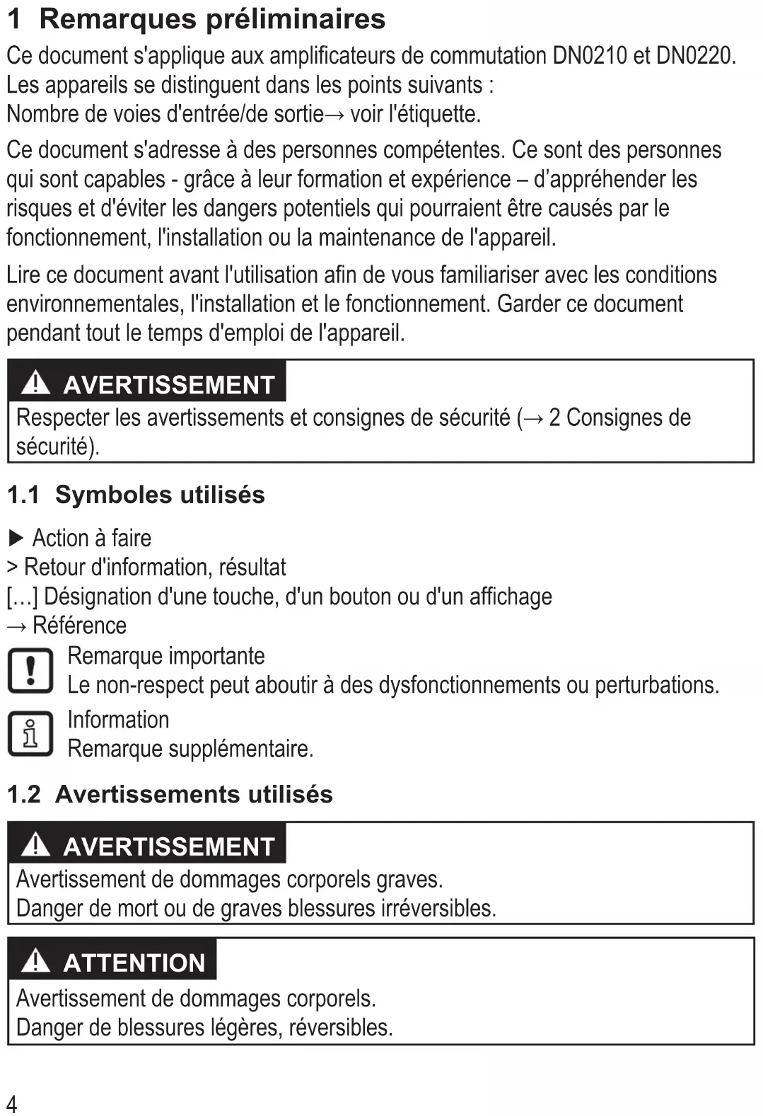 91 Homologations/normes 15 10 Correction d'erreurs 16 11 Entretien, réparation et élimination 16 111 Entretien 16 112 Nettoyage de la surface du boîtier 16 113 Réparation 16 114 Elimination des déchets 16 Ce document est la notice originale4 1 Remarques préliminaires Ce document s'applique aux amplificateurs de commutation DN0210 et DN0220 Les appareils se distinguent dans les points suivants : Nombre de voies d'entrée/de sortie→ voir l'étiquette. Ce document s'adresse à des personnes compétentes Ce sont des personnes qui sont capables - grâce à leur formation et expérience – d’appréhender les risques et d'éviter les dangers potentiels qui pourraient être causés par le fonctionnement, l'installation ou la maintenance de l'appareil Lire ce document avant l'utilisation afin de vous familiariser avec les conditions environnementales, l'installation et le fonctionnement Garder ce document pendant tout le temps d'emploi de l'appareil AVERTISSEMENT Respecter les avertissements et consignes de sécurité (→ 2 Consignes de sécurité)