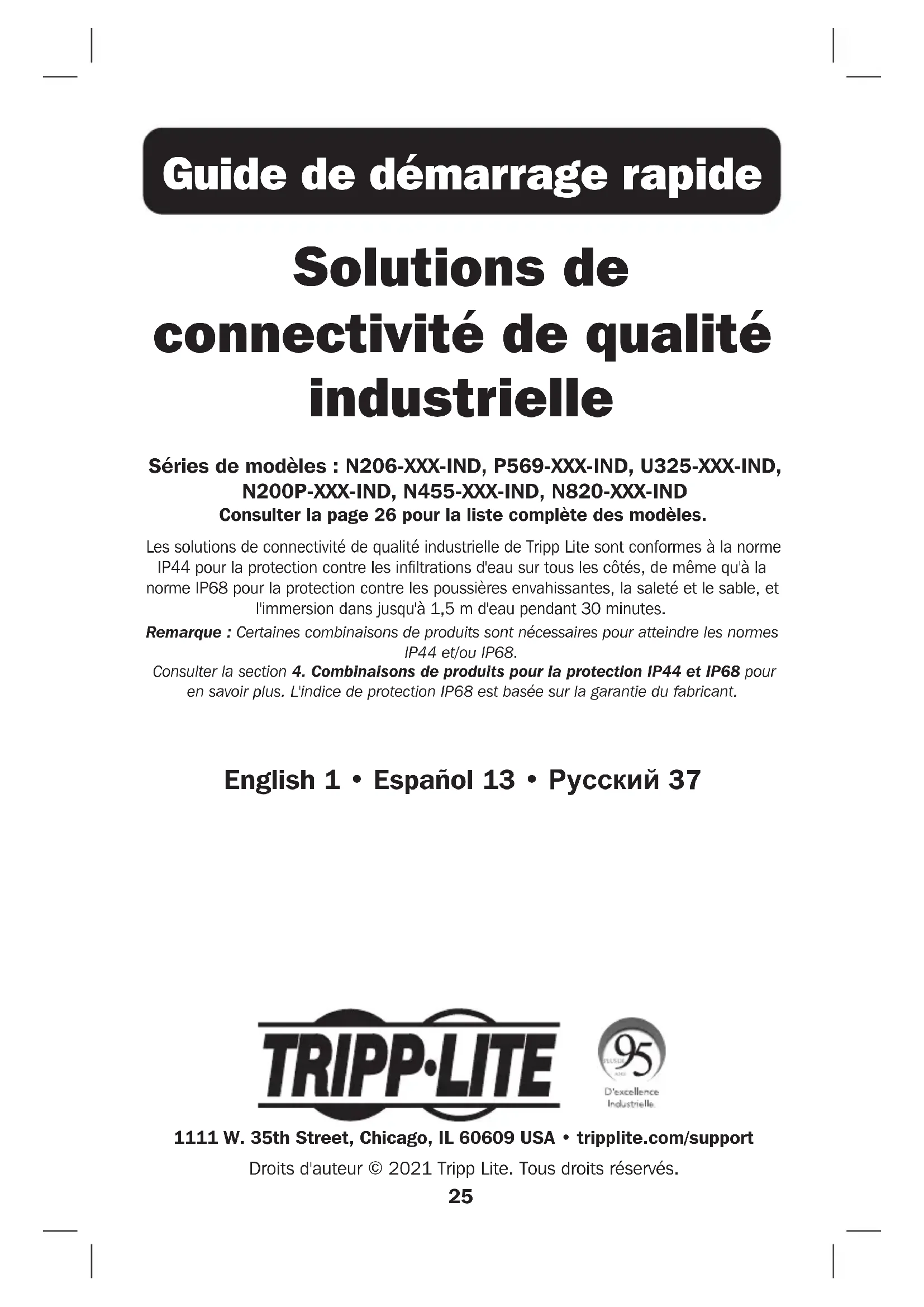 Consulter la page 26 pour la liste complète des modèles. Les solutions de connectivité de qualité industrielle de Tripp Lite sont conformes à la norme IP44 pour la protection contre les infiltrations d'eau sur tous les côtés, de même qu'à la norme IP68 pour la protection contre les poussières envahissantes, la saleté et le sable, et l'immersion dans jusqu'à 1,5 m d'eau pendant 30 minutes.Remarque : Certaines combinaisons de produits sont nécessaires pour atteindre les normes IP44 et/ou IP68. Consulter la section 4. Combinaisons de produits pour la protection IP44 et IP68 pour en savoir plus. L'indice de protection IP68 est basée sur la garantie du fabricant. 1111 W. 35th Street, Chicago, IL 60609 USA • tripplite.com/support Droits d'auteur © 2021 Tripp Lite. Tous droits réservés. English 1 • Español 13 • Русский 3726 Table des matières Liste complète des produits de solutions de connectivité 27 de qualité industrielle