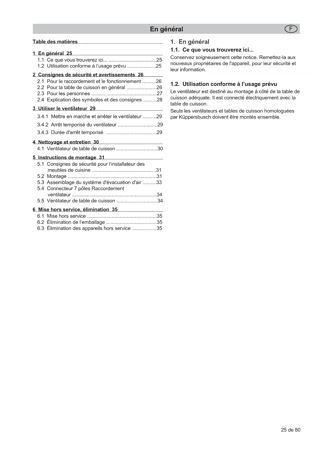 1.1. Ce que vous trouverez ici... Conservez soigneusement cette notice. Remettez-la aux nouveaux propriétaires de l'appareil, pour leur sécurité et leur information. 1.2. Utilisation conforme à l’usage prévu Le ventilateur est destiné au montage à côté de la table de cuisson adéquate. Il est connecté électriquement avec la table de cuisson. Seuls les ventilateurs et tables de cuisson homologuées par Küppersbusch doivent être montés ensemble. 1 En général 25