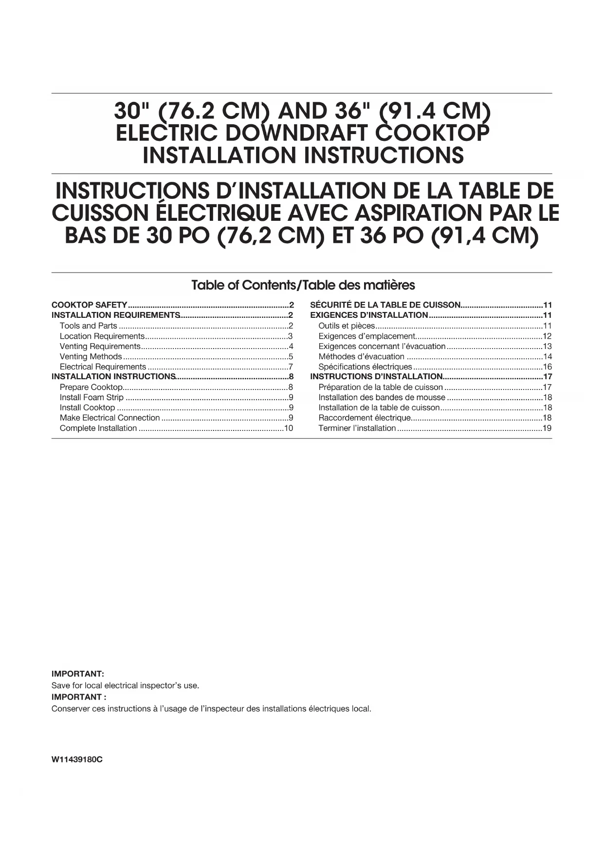 po x 10po (8,3cm x 25,4cm) – Référence de commandeA403Pour commander, voir la section «Assistance ou service» duGuide d’utilisation et d’entretien. n Brides de conduitConsulter les codes locaux. Vérier l’alimentation électrique existante. Voir la section «Spécications électriques».Il est recommandé de faire réaliser tous les raccordements électriques par un électricien qualié agréé.Risque possible de décès ou de blessure grave si vous ne suivez pas immédiatement les instructions. Risque possible de décès ou de blessure grave si vous ne suivez pas les instructions. Tous les messages de sécurité vous diront quel est le danger potentiel et vous disent comment réduire le risque de blessure et ce qui peut se produire en cas de non-respect des instructions. Votre sécurité et celle des autres est très importante. Nous donnons de nombreux messages de sécurité importants dans ce manuel et sur votre appareil ménager. Assurez-vous de toujours lire tous les messages de sécurité et de vous y conformer. AVERTISSEMENT DANGER Voici le symbole d’alerte de sécurité.Ce symbole d’alerte de sécurité vous signale les dangers potentiels de décès et de blessures graves à vous et à d’autres.Tous les messages de sécurité suivront le symbole d’alerte de sécurité et le mot “DANGER” ou “AVERTISSEMENT”. Ces mots signifient :12 Exigences d’emplacement IMPORTANT: Observer les dispositions de tous les codes et règlements en vigueur. Lors de l’installation de la table de cuisson, utiliser les dimensions minimales indiquées. n Utiliser les dimensions d’ouverture du comptoir qui sont indiquées dans ces instructions d’installation. Lesdimensions données sont les espacements minimaux etfournissent un dégagement de 0po (0cm). n Une source d’électricité avec liaison à la terre est nécessaire. Voir la section «Spécications électriques». n Si l’armoire comporte des tiroirs, ces tiroirs doivent être retirés et l’avant des tiroirs installé sur l’avant de l’armoire. n Pour éliminer les risques de brûlure ou d’incendie en se penchant au-dessus d’une surface qui chauffe, il est déconseillé d’utiliser l’espace de rangement des armoires situées au-dessus de l’appareil. Si des armoires de rangement sont prévues, le risque peut être réduit par l’installation d’une hotte de cuisinière ou d’un ensemble hotte/micro-ondes dépassant horizontalement de 5po (12,7cm) au moins par rapport au bas des armoires. IMPORTANT: Il n’est pas possible d’installer un four encastré sous comptoir sous ce produit. Dimensions du produit Table de cuisson de 30po (76,2cm) – Pour les modèles standard et électriques Table de cuisson de 36po (91,4 cm) – Pour les modèles standard et électriques A. 22