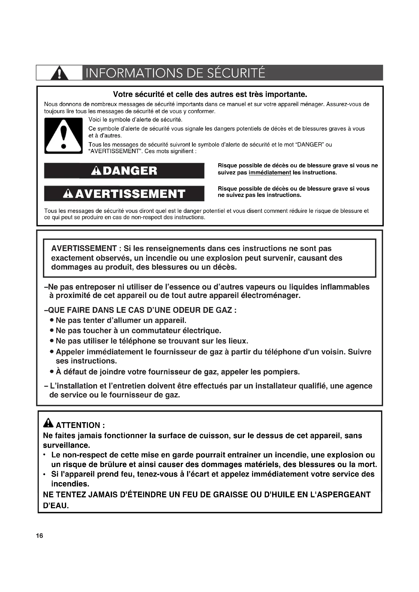 Ne faites jamais fonctionner la surface de cuisson, sur le dessus de cet appareil, sans surveillance. Le non-respect de cette mise en garde pourrait entrainer un incendie, une explosion ou un risque de brülure et ainsi causer des dommages matériels, des blessures ou la mort. Si l'appareil prend feu, tenez-vous å l'écart et appelez immédiatement votre service des incendies. NE TENTEZ JAMAIS D'ÉTEINDRE UN FEU DE GRAISSE OU D'HUILE EN L'ASPERGEANT D'EAU. ATTENTION :