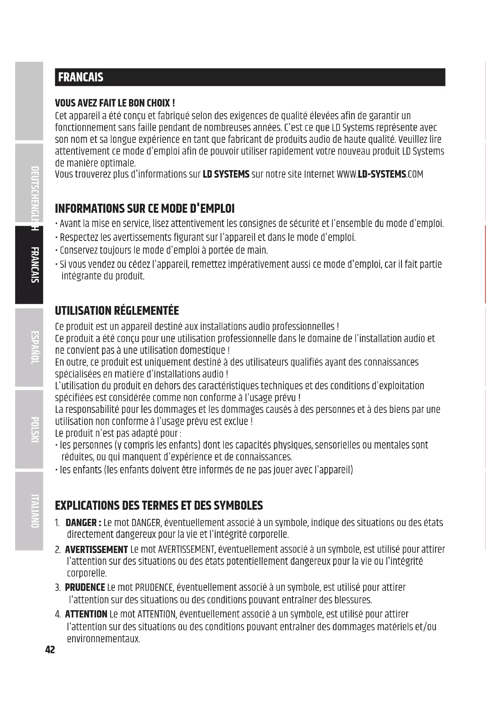 Hiermit erklärt die Adam Hall GmbH, dass dieser Funkanlagentyp der Richtlinie 2014/53/EU entspricht. Der vollständige Text der EU-Konformitätserklärung ist unter der folgenden Internetadresse verfügbar: www.adamhall.com/compliance/ Druckfehler und Irrtümer, sowie technische oder sonstige Änderungen sind vorbehalten! DEUTSCHFRANCAIS ESPAÑOL ENGLISH ITALIANO POLSKI42 FRANCAIS VOUS AVEZ FAIT LE BON CHOIX ! Cet appareil a été conçu et fabriqué selon des exigences de qualité élevées afin de garantir un fonctionnement sans faille pendant de nombreuses années. C'est ce que LD Systems représente avec son nom et sa longue expérience en tant que fabricant de produits audio de haute qualité. Veuillez lire attentivement ce mode d'emploi afin de pouvoir utiliser rapidement votre nouveau produit LD Systems de manière optimale. Vous trouverez plus d'informations sur LD SYSTEMS sur notre site Internet WWW.LD-SYSTEMS.COM