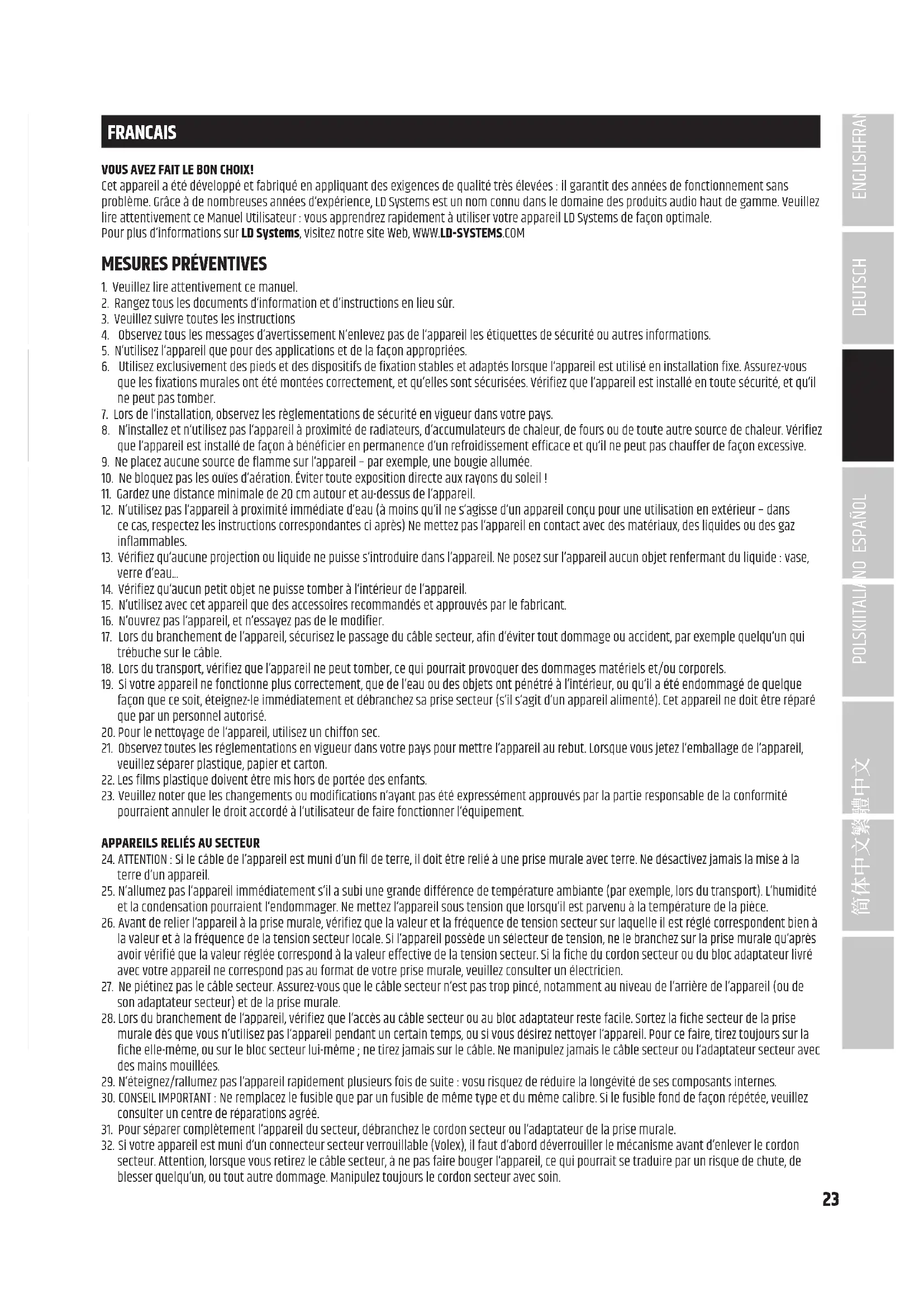 FRANCAIS VOUS AVEZ FAIT LE BON CHOIX! Cet appareil a été développé et fabriqué en appliquant des exigences de qualité très élevées : il garantit des années de fonctionnement sans problème. Grâce à de nombreuses années d‘expérience, LD Systems est un nom connu dans le domaine des produits audio haut de gamme. Veuillez lire attentivement ce Manuel Utilisateur : vous apprendrez rapidement à utiliser votre appareil LD Systems de façon optimale. Pour plus d‘informations sur LD Systems, visitez notre site Web, WWW.LD-SYSTEMS.COM