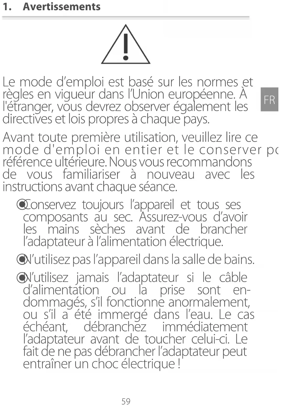 Le mode d’emploi est basé sur les normes et règles en vigueur dans l’Union européenne. À l'étranger, vous devrez observer également les directives et lois propres à chaque pays. Avant toute première utilisation, veuillez lire ce mode d'emploi en entier et le conserver pour référence ultérieure. Nous vous recommandons de vous familiariser à nouveau avec les instructions avant chaque séance.