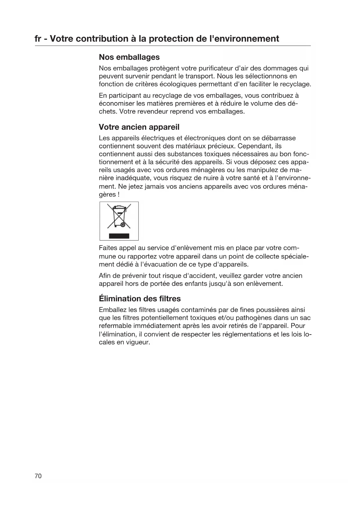 Nos emballages Nos emballages protègent votre purificateur d’air des dommages qui peuvent survenir pendant le transport. Nous les sélectionnons en fonction de critères écologiques permettant d'en faciliter le recyclage. En participant au recyclage de vos emballages, vous contribuez à économiser les matières premières et à réduire le volume des dé- chets. Votre revendeur reprend vos emballages. Votre ancien appareil Les appareils électriques et électroniques dont on se débarrasse contiennent souvent des matériaux précieux. Cependant, ils contiennent aussi des substances toxiques nécessaires au bon fonc- tionnement et à la sécurité des appareils. Si vous déposez ces appa- reils usagés avec vos ordures ménagères ou les manipulez de ma- nière inadéquate, vous risquez de nuire à votre santé et à l'environne- ment. Ne jetez jamais vos anciens appareils avec vos ordures ména- gères! Faites appel au service d'enlèvement mis en place par votre com- mune ou rapportez votre appareil dans un point de collecte spéciale- ment dédié à l'évacuation de ce type d'appareils. Afin de prévenir tout risque d'accident, veuillez garder votre ancien appareil hors de portée des enfants jusqu'à son enlèvement. Élimination des filtres Emballez les filtres usagés contaminés par de fines poussières ainsi que les filtres potentiellement toxiques et/ou pathogènes dans un sac refermable immédiatement après les avoir retirés de l'appareil. Pour l'élimination, il convient de respecter les réglementations et les lois lo- cales en vigueur.fr - Votre contribution à la protection de l'environnement