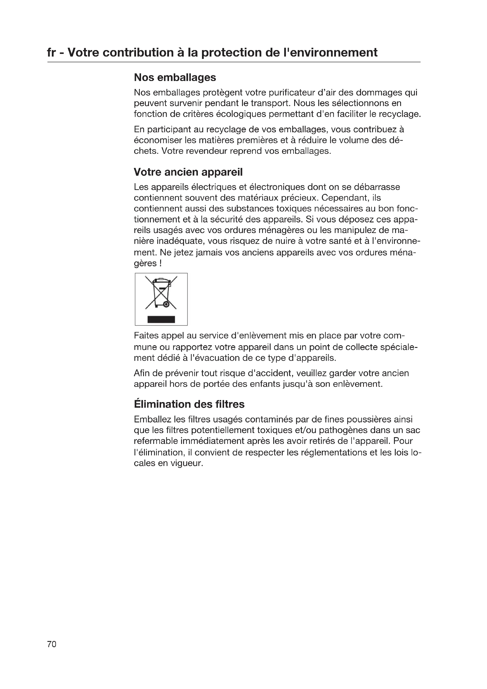 Nos emballages Nos emballages protègent votre purificateur d’air des dommages qui peuvent survenir pendant le transport. Nous les sélectionnons en fonction de critères écologiques permettant d'en faciliter le recyclage. En participant au recyclage de vos emballages, vous contribuez à économiser les matières premières et à réduire le volume des dé- chets. Votre revendeur reprend vos emballages. Votre ancien appareil Les appareils électriques et électroniques dont on se débarrasse contiennent souvent des matériaux précieux. Cependant, ils contiennent aussi des substances toxiques nécessaires au bon fonc- tionnement et à la sécurité des appareils. Si vous déposez ces appa- reils usagés avec vos ordures ménagères ou les manipulez de ma- nière inadéquate, vous risquez de nuire à votre santé et à l'environne- ment. Ne jetez jamais vos anciens appareils avec vos ordures ména- gères! Faites appel au service d'enlèvement mis en place par votre com- mune ou rapportez votre appareil dans un point de collecte spéciale- ment dédié à l'évacuation de ce type d'appareils. Afin de prévenir tout risque d'accident, veuillez garder votre ancien appareil hors de portée des enfants jusqu'à son enlèvement. Élimination des filtres Emballez les filtres usagés contaminés par de fines poussières ainsi que les filtres potentiellement toxiques et/ou pathogènes dans un sac refermable immédiatement après les avoir retirés de l'appareil. Pour l'élimination, il convient de respecter les réglementations et les lois lo- cales en vigueur.fr - Votre contribution à la protection de l'environnement