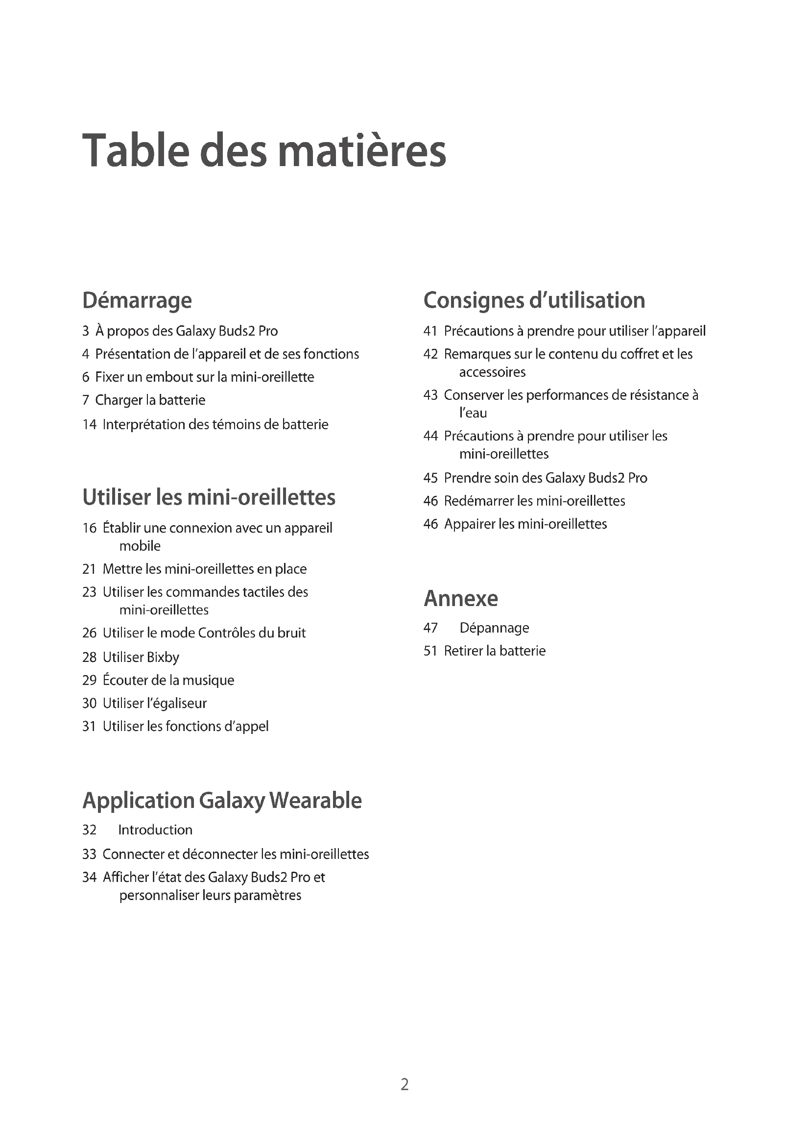 SM-R5102 Table des matières Démarrage 3 À propos des Galaxy Buds2 Pro 4 Présentation de l’appareil et de ses fonctions 6 Fixer un embout sur la mini-oreillette 7 Charger la batterie 14 Interprétation des témoins de batterie Utiliser les mini-oreillettes 16 Établir une connexion avec un appareil mobile 21 Mettre les mini-oreillettes en place 23 Utiliser les commandes tactiles des mini-oreillettes 26 Utiliser le mode Contrôles du bruit 28 Utiliser Bixby 29 Écouter de la musique 30 Utiliser l’égaliseur 31 Utiliser les fonctions d’appel Application Galaxy Wearable 32 Introduction 33 Connecter et déconnecter les mini-oreillettes 34 Afficher l’état des Galaxy Buds2 Pro et personnaliser leurs paramètres Consignes d’utilisation 41 Précautions à prendre pour utiliser l’appareil 42 Remarques sur le contenu du coffret et les accessoires 43 Conserver les performances de résistance à l’eau 44 Précautions à prendre pour utiliser les mini-oreillettes 45 Prendre soin des Galaxy Buds2 Pro 46 Redémarrer les mini-oreillettes 46 Appairer les mini-oreillettes Annexe 47 Dépannage 51 Retirer la batterie3 Démarrage À propos des Galaxy Buds2 Pro Les Galaxy Buds2 Pro sont des mini-oreillettes sans fil qui vous permettent d’écouter de la musique ou de répondre à des appels tout en faisant autre chose, comme du sport, après les avoir connectées à votre appareil mobile. Ne jamais porter les mini-oreillettes dans les endroits à trafic dense, comme les routes ou les passages pour piétons. Vous risquez un accident en raison des temps de réaction plus lents.Démarrage
