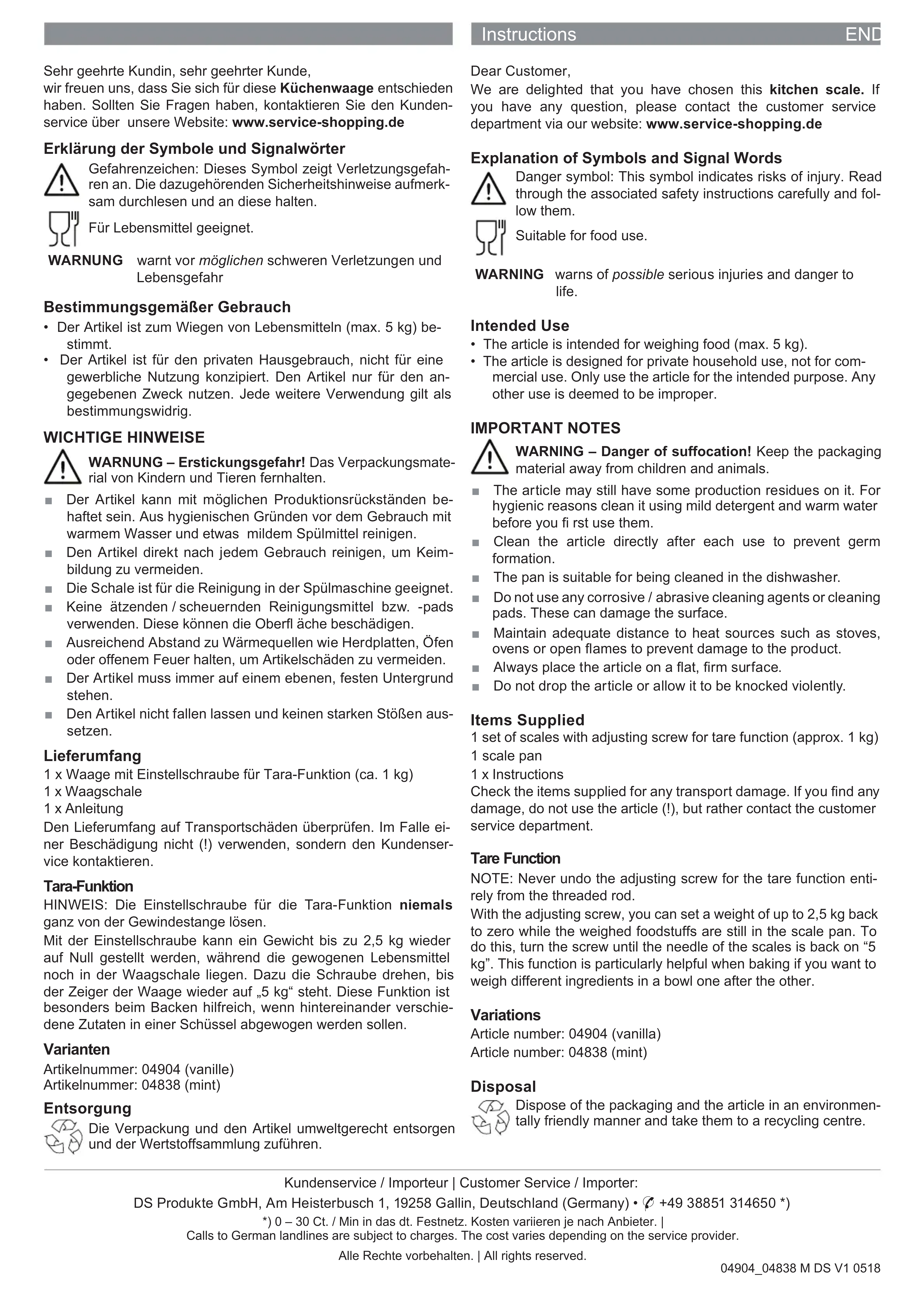 - L’article est conçu pour un usage exclusivement domestique, non professionnel. Utilisez l’article aux seules fi ns stipulée. Toute autre utilisation est considérée comme non conforme. Remarques importantes AVERTISSEMENT ! Risque d’asphyxie ! Tenez le maté- riau d’emballage éloigné des enfants et des animaux. ■ L’article peut comporter des résidus de production. Pour cela, nettoyez soigneusement tous les pièces avant la première uti- lisation. ■ Nettoyez l’article directement après l’usage pour prévenir la formation de germes. ■ Le bol est lavable au lave-vaisselle. ■ N’utilisez pas de produits de nettoyage ni de tampons corrosifs / abrasifs. Ceux-ci risqueraient d’en endommager la surface. ■ Pour ne pas risquer d’endommager l’article, placez-la à une distance suffi sante d’autres sources de chaleur, par ex. des plaques de cuisson ou d’un four. ■ Placez toujours l’article sur une surface plane et solide. ■ Ne faites pas tomber l’article et ne lui faites pas subir de chocs violents. Composition 1 balance avec vis de réglage pour la fonction de tare (env. 2,5 kg) 1 bol de pesée 1 mode d’emploi Assurez-vous que l’ensemble livré ne présente pas de dommages imputables au transport. En cas de dommage, n’utilisez pas l’ar- ticle (!) et contactez le service après-vente. Fonction de tare CONSEIL: Ne desserrez jamais complètement de la tige fi letée la vis de réglage servant à la tare. La vis de réglage vous permet de placer la balance à zéro alors qu’elle supporte déjà un poids d’aliments dans son bol pouvant aller jusqu’à 2,5 kg. Tournez à cet effet la vis jusqu’à ce que la fl èche de la balance indique à nouveau « 5 kg ». Cette fonction est particulièrement pratique pour la pâtisserie car elle permet de peser différents aliments les uns à la suite des autres dans un seul et même récipient. Variations Référence article : 04904 (vanille) Référence article : 04838 (menthe verte) Mise au rebut Débarrassez-vous de l’article et de son emballage dans le respect de l’environnement en le déposant à un point de collecte prévu à cet effet. Geachte klant, We zijn blij dat u deze keukenwaag hebt gekozen. Als u vragen hebt, contacteert u de klantenservice via onze website: www.service-shopping.de Uitleg van de symbolen en signaalwoorden Gevarensymbol: deze symbol geeft verwondingsgevaren aan. Lees de bijbehorende veiligheidsaanwijzingen aan- dachtig door en volg ze op. Geschikt voor levensmiddelen. WAARSCHUWING waarschuwt voor mogelijk ernstig letsel en levensgevaar Doelmatig gebruik