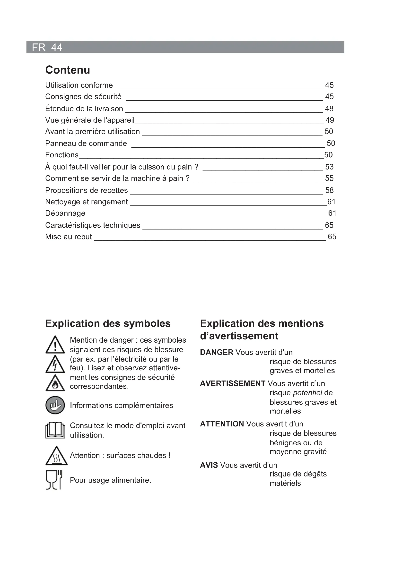 - Tout défaut imputable à une utilisation non conforme, à une détérioration ou à des tentatives de réparation est exclu de la garantie. L’usure normale est également exclue de la garantie. Consignes de sécurité ■ Cet appareil peut être utilisé par les enfants à partir de 8 ans et les personnes dont les capacités physiques, sensorielles ou mentales sont réduites ou qui manquent d’expérience et/ou de connaissances lorsqu'elles sont sous surveillance ou qu’elles ont été instruites quant à l'utilisation de l'appareil en toute sécurité et qu'elles ont compris les risques en découlant. Les enfants ne doivent pas jouer avec l'appareil. Le nettoyage et l'entretien utilisateur ne doivent pas être réalisés par les enfants sauf s'ils ont plus de 8 ans et qu'ils sont sous surveillance. ■ Tenez l'appareil et son cordon d'alimentation hors de portée des animaux et des enfants de moins de 8 ans. Chère cliente, cher client, Nous vous félicitons d'avoir fait l'acquisition de notre machine à pain. Veuillez lire attentivement le présent mode d’emploi avant la première utilisation de l’appareil et le conserver précieusement pour toute consultation ultérieure. Si vous donnez ou prêtez cet appareil à une tierce personne, n'oubliez pas d'y joindre ce mode d'emploi. Il fait partie intégrante de l’appareil. Le fabricant et l'importateur déclinent toute responsabilité en cas de non-observation des instructions qu'il contient. Pour toute question concernant l'appareil et ses pièces de rechange et accessoires, vous pouvez contacter le service après-vente à partir de notre site Internet : www.service-shopping.deFR 46 ■ L'appareil n'est pas conçu pour une utilisation avec un minuteur auxiliaire ou un système de commande à distance externe. ■ Ne remplissez pas trop la cuve. La contenance maximale est de : – 400 g d'ingrédients secs et 220 ml de liquide pour différentes sortes de pain – 500 g de fruits pour la confi ture – 600 ml de liquide pour le yaourt – 250 g d'ingrédients secs ou 400 ml de liquide pour toutes les autres préparations ATTENTION : surfaces chaudes ! À l'utilisation, l'appareil devient très chaud. Prenez absolument soin de ne pas entrer en contact avec les parties chauffées pendant et après l'utilisation de l'appareil. Lorsque l'appareil fonctionne ou immédiatement après l'avoir arrêté, seuls les poignées et les boutons de réglage peuvent être saisis. Transportez et rangez l'appareil uniquement lorsqu'il a intégralement refroidi. Utilisez des gants de cuisine appropriés pour manipuler l'appareil. ■ L'appareil doit toujours être débranché du secteur lorsqu'il n'est pas sous surveillance, avant d'être assemblé, démonté et net- toyé. ■ Pour votre propre sécurité, contrôlez l'appareil avant chaque utilisation et assurez-vous qu'il ne présente aucun dommage. Utilisez-le uniquement lorsque l'appareil, le cordon d'alimenta- tion et la fi che ne présentent aucun dommage ! ■ Si l'appareil lui-même, son cordon d'alimentation ou sa fi che sont endommagés, c'est au fabricant, au service après-vente ou à toute personne aux qualifi cations similaires (par ex. un atelier spécialisé) qu'il revient de le réparer afi n d'éviter tout danger. ■ ATTENTION : respectez les consignes de nettoyage mentionnées au paragraphe « Nettoyage » ! DANGER – risque d’électrocution ■ Utilisez et entreposez l’appareil uniquement dans des pièces fermées. Ne faites pas fonctionner l’appareil dans des pièces à fort taux d’humidité.47 FR ■ Si le corps de l’appareil devait tomber à l’eau, coupez immédiatement l’alimentation électrique. N’essayez pas d’extraire l’appareil de l’eau tant qu’il est encore raccordé au réseau électrique ! Faites vérifi er l’appareil dans un atelier spécialisé avant de le remettre en marche. ■ Ne saisissez jamais l’appareil ni le cordon de raccordement à mains humides lorsque ces composants sont raccordés au réseau électrique. ■ Ne plongez jamais l’appareil, le cordon d’alimentation et la fi che secteur dans l’eau ou tout autre liquide et assurez-vous qu’ils ne risquent pas de tomber dans l’eau ou d’être mouillés. ■ Si l’appareil devait tomber à l’eau, coupez immédiatement l’alimentation électrique. N’essayez pas d’extraire l’appareil de l’eau tant qu’il est encore raccordé au réseau électrique ! AVERTISSEMENT – Risque de blessures ! ■ Risque d’asphyxie ! Ne laissez pas les emballages à la portée des enfants ou des animaux. ■ Risque de brûlures dues à la chaleur, la vapeur chaude ou l’eau de condensa- tion ! Soyez prudent à l’ouverture de l’appareil. De la vapeur peut s’échapper lorsque vous ouvrez l’appareil. Pour cette raison, tenez votre visage et vos mains éloignés de la zone dangereuse. Nous recommandons par ailleurs l’emploi de maniques ou de gants de cuisine lorsque vous ouvrez le couvercle ou lorsque vous souhaitez sortir le panier à friture avec les plats préparés. ■ Risque de trébucher ! Afi n que personne ne risque de trébucher, veillez à ce que le cordon d’alimentation branché ne gêne pas le passage. ■ L'appareil doit être utilisé et rangé uniquement hors de portée des enfants. ■ Tenez les vêtements tels que les foulards, écharpes, cravates ainsi que les cheveux longs éloignés de l'appareil. ■ Arrêtez toujours l'appareil avant d'en extraire la cuve. AVERTISSEMENT – risque d’incendie ■ N'utilisez pas l'appareil dans des locaux renfermant des poussières facilement in- fl ammables ou des vapeurs nocives ou explosives. ■ Ne faites pas fonctionner l'appareil dans un environnement très humide ni à proximité de matières infl ammables. ■ Afi n d'éviter toute détérioration de l'appareil, veillez à le placer à une distance suf- fi sante de toute source de chaleur, comme des plaques de cuisson ou un four. Ne placez aucune fl amme 