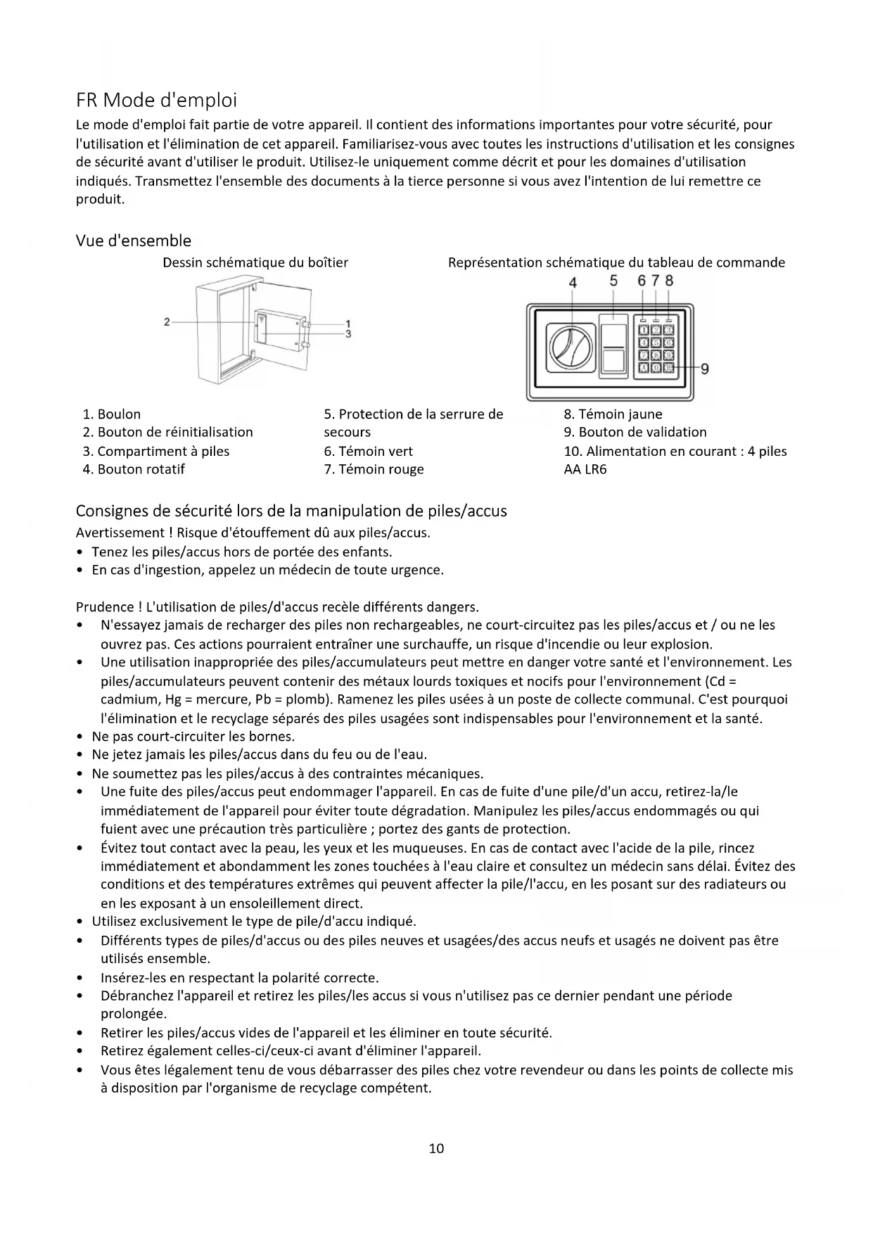 - Vous êtes légalement tenu de vous débarrasser des piles chez votre revendeur ou dans les points de collecte mis à disposition par l'organisme de recyclage compétent.11 Contenu du coffret Vérifiez le contenu de l'emballage du coffre-fort avant d'utiliser ce dernier. Veuillez vous adresser à notre service après-vente si une pièce manque ou est endommagée. 1 Coffre-fort 2 Clés de secours 1 Mode d'emploi Porte-clés