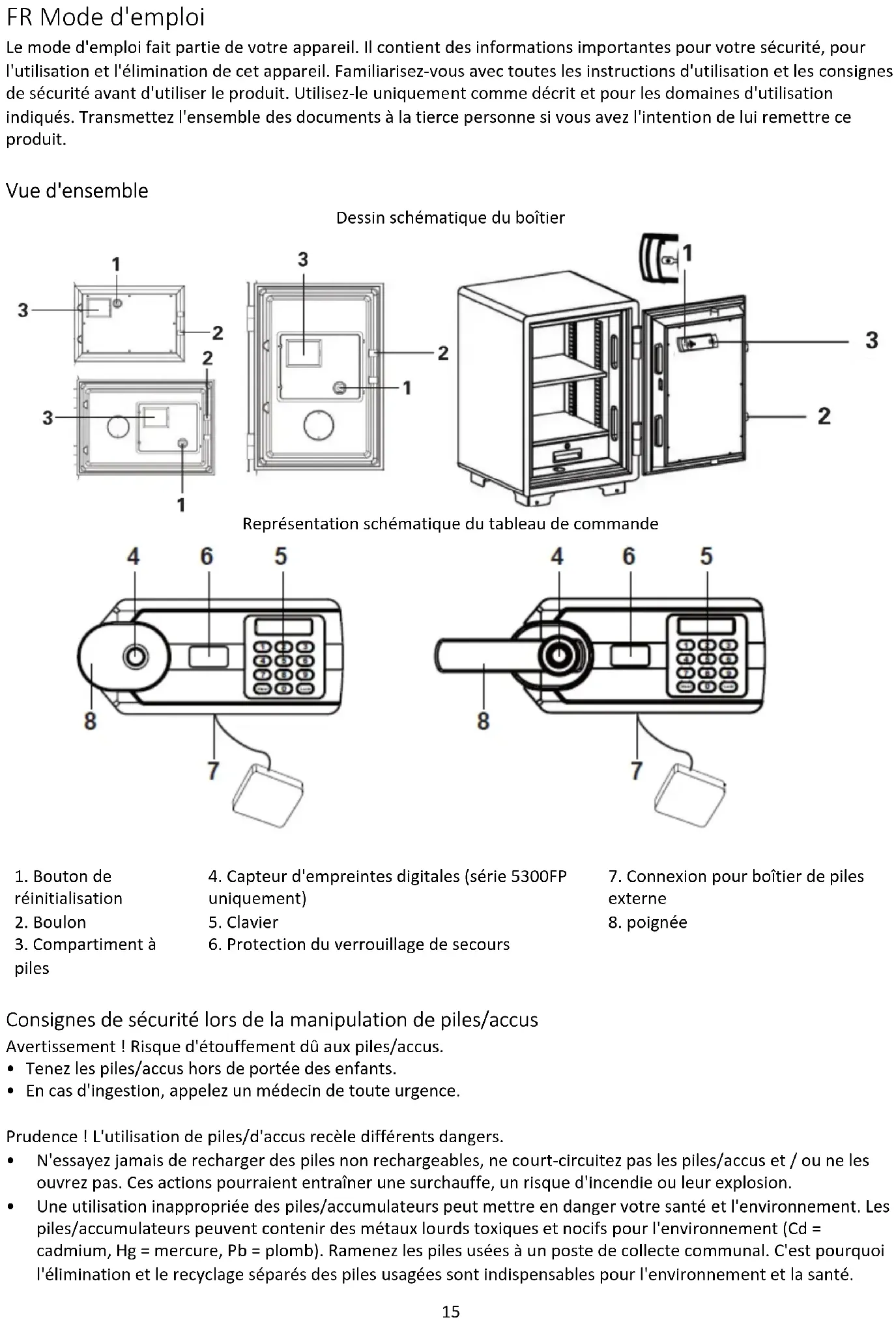 - 1 mode d'emploi Réglage Ouvrir le coffre-fort pour la première fois / Ouvrir le coffre-fort avec la clé de secours : Variante 1 : Ouverture par alimentation électrique externe Insérez les piles dans le compartiment à piles externe. Connectez le boîtier de batterie externe à l'interface du coffre-fort (voir "Représentation schématique du tableau de commande") Ouvrir le coffre-fort avec un code utilisateur/une empreinte digitale (uniquement pour la série 5300FP) Variante 2 :