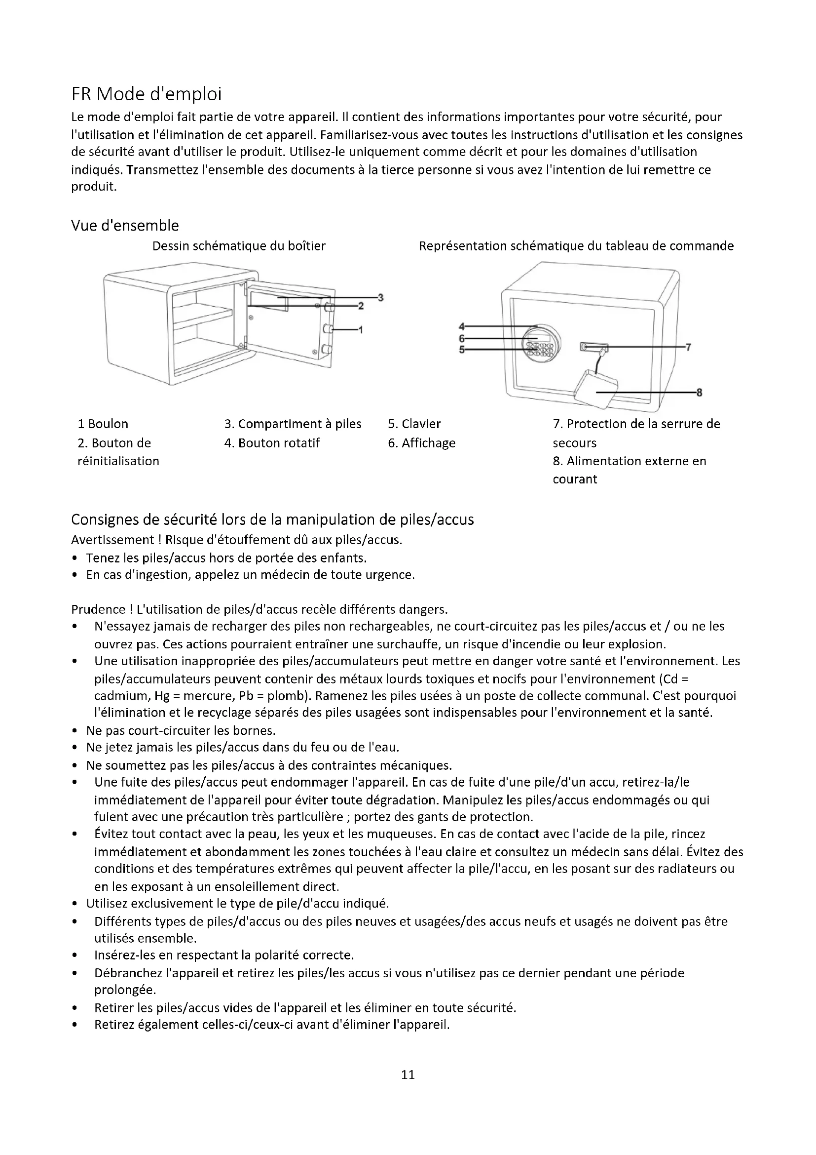 - Vous êtes légalement tenu de vous débarrasser des piles chez votre revendeur ou dans les points de collecte mis à disposition par l'organisme de recyclage compétent. Contenu du coffret Vérifiez le contenu de l'emballage du coffre-fort avant d'utiliser ce dernier. Veuillez vous adresser à notre service après-vente si une pièce manque ou est endommagée.