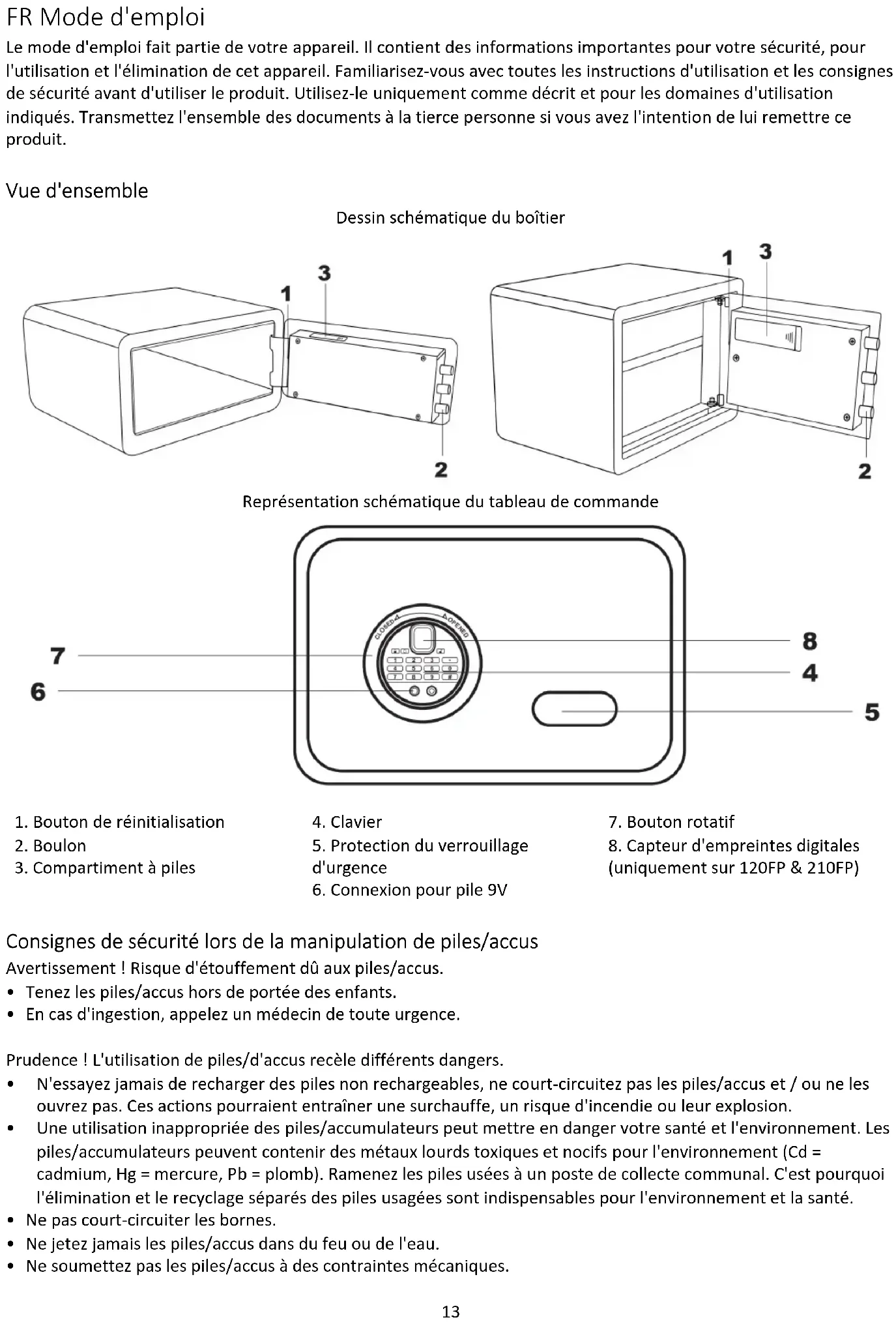 - Vous êtes légalement tenu de vous débarrasser des piles chez votre revendeur ou dans les points de collecte mis à disposition par l'organisme de recyclage compétent. Contenu du coffret Vérifiez le contenu de l'emballage du coffre-fort avant d'utiliser ce dernier. Veuillez vous adresser à notre service après-vente si une pièce manque ou est endommagée.