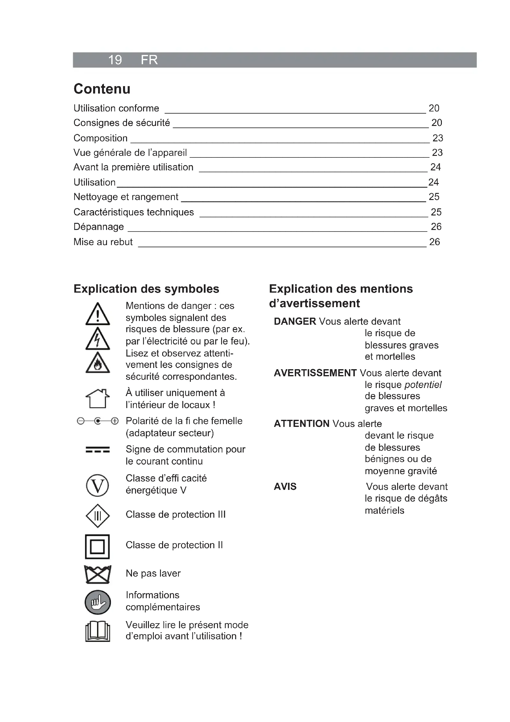 Classe d’effi cacité énergétique V Classe de protection III Classe de protection II Ne pas laver Informations complémentaires Veuillez lire le présent mode d’emploi avant l’utilisation ! Explication des mentions d’avertissement DANGER Vous alerte devant le risque de blessures graves et mortelles AVERTISSEMENT Vous alerte devant le risque potentiel de blessures graves et mortelles ATTENTION Vous alerte devant le risque de blessures bénignes ou de moyenne gravité AVIS Vous alerte devant le risque de dégâts matérielsFR 20 Utilisation conforme