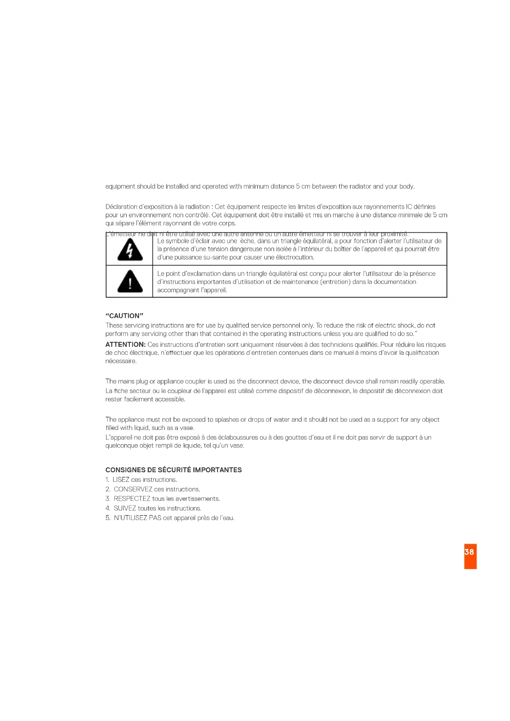 2. L’utilisateur de l’appareil doit accepter tout brouillage radioélectrique subi, même si le brouillage est susceptible d’en compromettre le fonctionnement. This Class B digital apparatus complies with Canadian ICES-003. Cet appareil numérique de la classe B est conforme à la norme NMB-003 du Canada. This device and its antenna(s) must not be co-located or operating in conjunction with any other antenna or transmitter, except tested built-in radios. Cet appareil et son antenne ne doivent pas être situés ou fonctionner en conjonction avec une autre antenne ou un autre émetteur, exception faites des radios intégrées qui ont été testées. The County Code Selection feature is disabled for products marketed in the US/ Canada. La fonction de sélection de l’indicatif du pays est désactivée pour les produits commercialisés aux États-Unis et au Canada. IC Radiation Exposure Statement This equipment complies with IC RSS-102 radiation exposure limit set forth for an uncontrolled environment. This This lightning ash with arrowhead symbol within an equilateral triangle is intended to alert the user to the presence of uninsulated dangerous voltage within the product’s enclosure that may be of sucient magnitude to constitute a risk of electric shock to persons. The exclamation point within an equilateral triangle is intended to alert the user to the presence of important operating and maintenance (servicing) instructions in the literature accompanying the product.38 equipment should be installed and operated with minimum distance 5 cm between the radiator and your body. Déclaration d’exposition à la radiation : Cet équipement respecte les limites d’exposition aux rayonnements IC dénies pour un environnement non contrôlé. Cet équipement doit être installé et mis en marche à une distance minimale de 5 cm qui sépare l’élément rayonnant de votre corps. L’émetteur ne doit ni être utilisé avec une autre antenne ou un autre émetteur ni se trouver à leur proximité. “CAUTION” These servicing instructions are for use by qualied service personnel only. To reduce the risk of electric shock, do not perform any servicing other than that contained in the operating instructions unless you are qualied to do so.” ATTENTION: Ces instructions d’entretien sont uniquement réservées à des techniciens qualiés. Pour réduire les risques de choc électrique, n’eectuer que les opérations d’entretien contenues dans ce manuel à moins d’avoir la qualication nécessaire. The mains plug or appliance coupler is used as the disconnect device, the disconnect device shall remain readily operable. La che secteur ou le coupleur de l’appareil est utilisé comme dispositif de déconnexion, le dispositif de déconnexion doit rester facilement accessible. The appliance must not be exposed to splashes or drops of water and it should not be used as a support for any object lled with liquid, such as a vase. L’appareil ne doit pas être exposé à des éclaboussures ou à des gouttes d’eau et il ne doit pas servir de support à un quelconque objet rempli de liquide, tel qu’un vase.