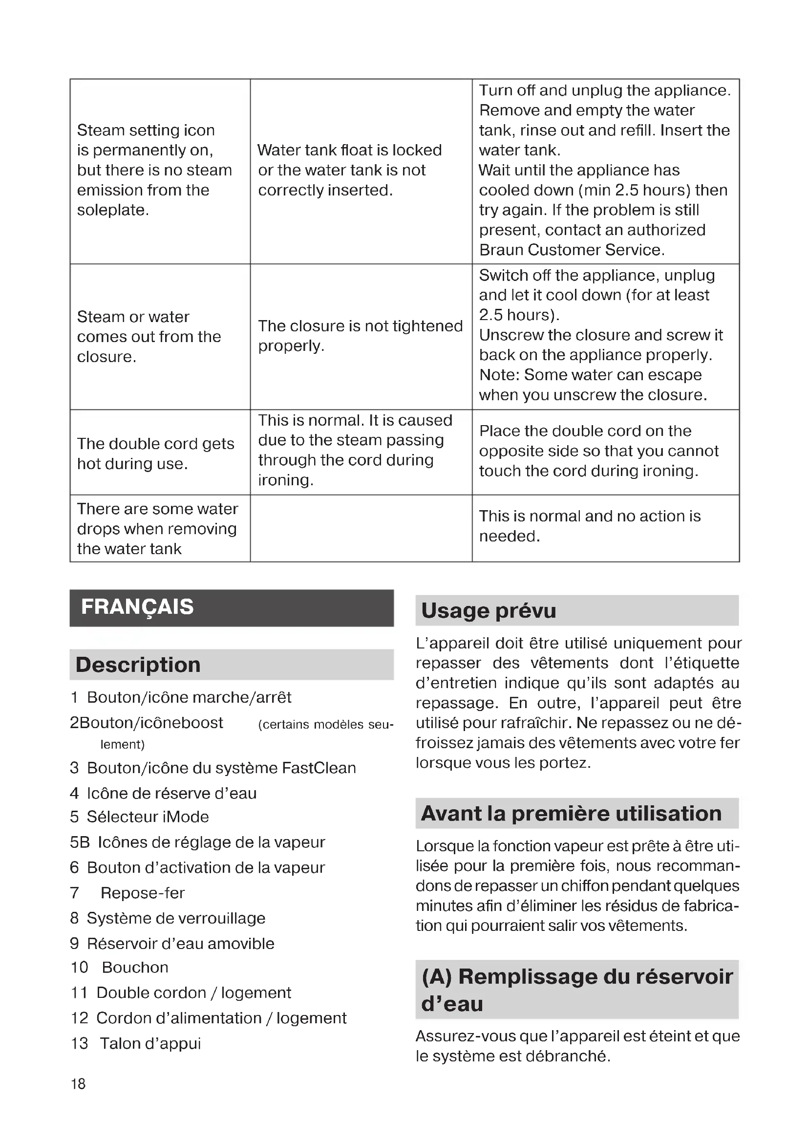 Pour déverrouiller le fer à repasser, enfoncez le bouton sur la glissière (verrouillage facile). Le fer à repasser est alors déverrouillé. 5712812451_IS72xx_INT.indd 215712812451_IS72xx_INT.indd 21 08.11.21 08:3008.11.21 08:3022 Rangement Débranchez, videz le réservoir d’eau et lais- sez l’appareil se refroidir avant d’enrouler les cordons pour les ranger. Pour un rangement pratique du cordon d’alimentation, reportez-vous également à « Certification ergonomique ». Garantie et service Pour des informations détaillées, voir la no- tice de garantie et de service ou consulter le site www.braunhousehold.com. Guide de dépannage Problème Cause Solution L’appareil ne s’allume pas. L’appareil n’est pas branché à une prise de courant. Assurez-vous que l’appareil est raccordé correctement et ap- puyez sur le bouton marche/arrêt. De la vapeur s’échappe sous l’unité de base. Le système de sécurité de pression « max » s’est ouvert. Éteignez immédiatement l’appar- eil et contactez un service après- vente agréé Braun. Quelques gouttes d’eau s’échappent des trous situés sous la semelle. De l’eau s’est condensée à l’intérieur des tubes car la vapeur est utilisée pour la première fois ou n’a pas été utilisée pendant un certain temps. Appuyez plusieurs fois sur le bouton d’activation de la vapeur, loin de la planche à repasser. Cela éliminera l’eau froide du circuit de vapeur. Un liquide de couleur marron s’échappe de la semelle. Des adoucissants d’eau de nature chimique ou des additifs ont été versés dans le réservoir d’eau. Ne versez jamais de produits dans le réservoir d’eau. Nettoyez la se- melle à l’aide d’un chiffon humide et rincez le chauffe-eau. Vous constatez un dé- gagement de fumée ou une odeur lors de la première mise en marche de l’appareil. Certaines pièces ont été traitées à l’aide d’un enduit protecteur ou d’un lubrifiant qui s’évapore la première fois que le fer à repasser chauffe. Cela est normal et cessera lorsque vous aurez utilisé le fer à repasser plusieurs fois. Si la fumée/l’odeur est toujo- urs présente après avoir éteint l’appareil, contactez un service après-vente agréé Braun. L’appareil émet un bruit intermittent as- socié à des vibrations. De l’eau est en train d’être pompée dans le chauffe- eau. Cela est normal. Vous n’avez rien à faire. Le bouchon est diffi- cile à dévisser. Du tartre s’est formé et rend difficile l’ouverture du bouchon. Tournez le capuchon énergique- ment. Pour éviter ce problème, détartrez fréquemment le sys- tème. Le chauffe-eau est encore sous pression. N’ouvrez jamais le bouchon si le chauffe-eau est encore sous pression ou s’il est chaud. Atten- dez au moins 2,5 heures avant d’ouvrir le bouchon. 5712812451_IS72xx_INT.indd 225712812451_IS72xx_INT.indd 22 08.11.21 08:3008.11.21 08:3023 L’icône ne se réini- tialise pas après avoir rempli le réservoir d’eau. Le flotteur ne fonctionne pas correctement. Videz le réservoir d’eau, rincez-le et remplissez-le à nouveau. Le réservoir d’eau n’est pas positionné correctement. Positionnez-le correctement. Toutes les DEL cligno- tent. Erreur du système. Débranchez l’appareil, rebran- chez-le et appuyez sur le bouton marche/arrêt. Si ce problème persiste, éteignez immédiate- ment l’appareil, débranchez-le et contactez un service après-vente agréé Braun. L’icône de la fonction vapeur reste allumée en permanence mais aucune vapeur ne sort de la semelle. Le flotteur du réservoir d’eau est bloqué ou le réservoir d’eau n’est pas positionné correctement. Éteignez et débranchez l’appa- reil. Retirez et videz le réservoir d’eau, rincez-le et remplissez-le à nouveau. Replacez le réservoir d’eau. Patientez jusqu’à ce que l’appareil soit complètement refroidi (au minimum 2,5 heures), puis réessayez. Si le problème persiste, contactez un service après-vente agréé Braun. De la vapeur ou de l’eau s’échappe du bouchon. Le bouchon n’est pas serré correctement. Éteignez l’appareil, débranchez- le et laissez-le refroidir (pendant au moins 2,5 heures). Dévissez le bouchon et revissez- le correctement sur l’appareil. Remarque : il est possible que de l’eau s’échappe lorsque vous dévissez le bouchon. Le double cordon de- vient chaud pendant l’utilisation. Cela est normal. Cela est dû à la circulation de la vapeur dans le cordon pendant le repassage. Positionnez le double cordon du côté opposé de sorte à ce que vous ne puissiez pas toucher le cordon pendant le repassage. Il y a des gouttes d’eau lorsque le réservoir d’eau est retiré. Cela est normal. Vous n’avez rien à faire. ESPAÑOL Descripción 1 Botón de encendido/apagado 2 Icono/botón de Boost (solo ciertos modelos) 3 Icono/botón del sistema FastClean 4 Icono de reserva de agua 5a Selector iMode 5b Iconos de ajuste de vapor 6 Botón de vapor 7 Superficie de apoyo de la plancha 8 Sistema de bloqueo 5712812451_IS72xx_INT.indd 235712812451_IS72xx_INT.indd 23 08.11.21 08:3008.11.21 08:3024 9 Depósito de agua extraíble 10 Cierre 11 Almacenamiento/cable doble 12 Almacenamiento/cable de alimentación 13 Parte trasera de apoyo Uso previsto El aparato solo debe utilizarse para planchar las prendas adecuadas según la etiqueta de cuidados. Además, el aparato también se puede utilizar para refrescar prendas. Nun- ca planche ni humedezca prendas mientras las lleva puestas. Antes del primer uso Le recomendamos que planche sobre un trapo viejo cuando el vapor esté listo por primera vez para evitar manchar la ropa con residuos del proceso de fabricación. (A) Llenado del depósito de agua Asegúrese de que el aparato se encuentra apagado y el sistema esté desenchufado.