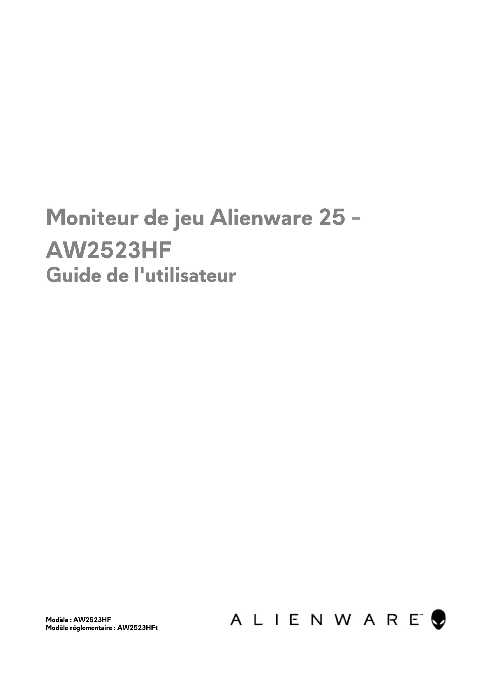 Modèle : AW2523HF Modèle réglementaire : AW2523HFt Moniteur de jeu Alienware 25 - AW2523HF Guide de l'utilisateurREMARQUE : Une REMARQUE indique des informations importantes qui vous aident à mieux utiliser votre ordinateur. ATTENTION : ATTENTION indique des dommages potentiels au matériel ou une perte de données si les instructions ne sont pas suivies.