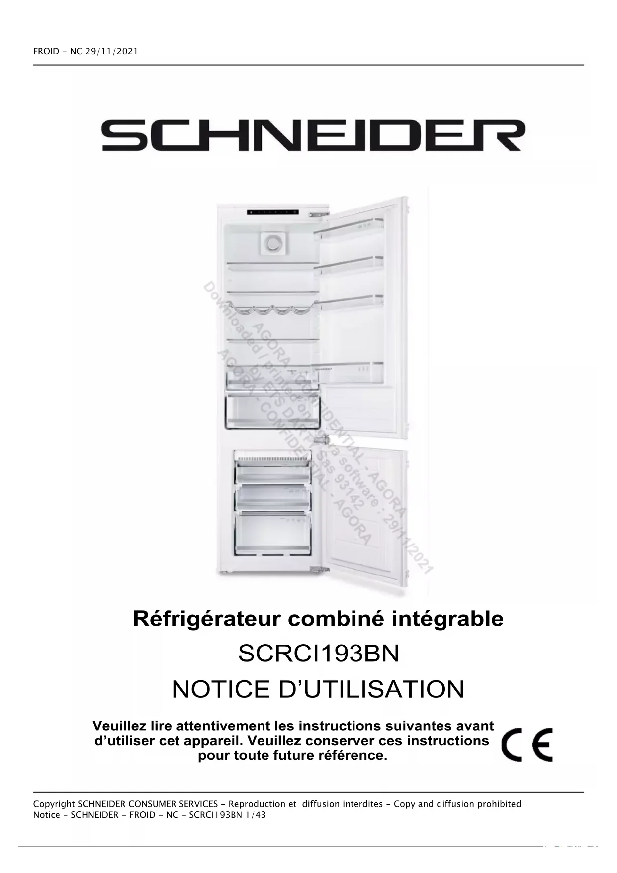 toute utilisation d'accessoires non fournis ou non approuvés par le fabricant. La garantie sera annulée en cas d'élimination de la plaq ue signalétiq ue et/ ou du numéro de série du produit. FROID - NC 29/11/2021Copyright SCHNEIDER CONSUMER SERVICES - Reproduction et diffusion interdites - Copy and diffusion prohibitedNotice - SCHNEIDER - FROID - NC - SCRCI193BN 40/43G a ra n t i e du p ro du i t e t p i è c e s de re c h a n g e di s p o n i b l e s S elon les termes de la garantie du fabricant applicable au lieu, l' utilisation du S ervice à la clientèle est gratuite. La durée minimale de la garantie ( garantie du fabricant pour les consommateurs privés) dans l' Espace Economique Européen est de 2 ans selon les termes de garantie applica-ble au lieu. Les conditions de garantie n' affectent pas les autres droits ou réclamations détenus par vous-mê me en vertu de la législation locale. Des informations détaillées sur la période de garantie et les conditions de garantie dans votre pays sont disponibles auprès du service à la clientèle, de votre revendeur ou de notre site Web. Les pièces de rechange d'origine fonctionnelles selon la directive écoconception correspondante peuvent être obtenues auprès du service à la clientèle pendant une période d'au moins 4 ans à compter de la date de mise sur le marché de votre appareil dans l'Espace économique européen. Pour plus de spécifications techniques sur l'agent de réparation et pour commander des pièces de rechange, veuillez vous rendre sur : https: / / w w w .schneiderconsumer.com FR-41