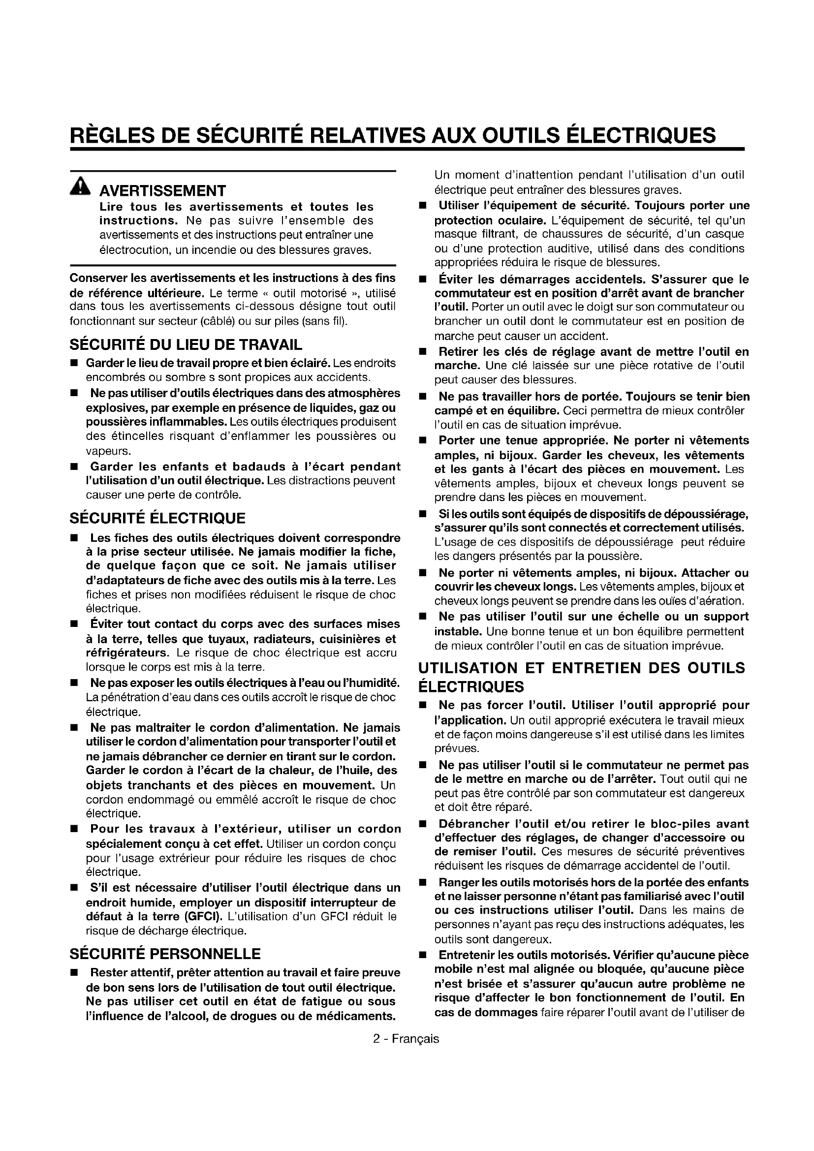 Les fiches des outils électriques doivent correspondre à la prise secteur utilisée. Ne jamais modifier la fiche, de quelque façon que ce soit. Ne jamais utiliser d’adaptateurs de fiche avec des outils mis à la terre. Les fiches et prises non modifiées réduisent le risque de choc électrique. Éviter tout contact du corps avec des surfaces mises à la terre, telles que tuyaux, radiateurs, cuisinières et réfrigérateurs. Le risque de choc électrique est accru lorsque le corps est mis à la terre. Ne pas exposer les outils électriques à l’eau ou l’humidité. La pénétration d’eau dans ces outils accroît le risque de choc électrique. Ne pas maltraiter le cordon d’alimentation. Ne jamais utiliser le cordon d’alimentation pour transporter l’outil et ne jamais débrancher ce dernier en tirant sur le cordon. Garder le cordon à l’écart de la chaleur, de l’huile, des objets tranchants et des pièces en mouvement. Un cordon endommagé ou emmêlé accroît le risque de choc électrique. Pour les travaux à l’extérieur, utiliser un cordon spécialement conçu à cet effet. Utiliser un cordon conçu pour l’usage extrérieur pour réduire les risques de choc électrique. S’il est nécessaire d’utiliser l’outil électrique dans un endroit humide, employer un dispositif interrupteur de défaut à la terre (GFCI). L’utilisation d’un GFCI réduit le risque de décharge électrique.