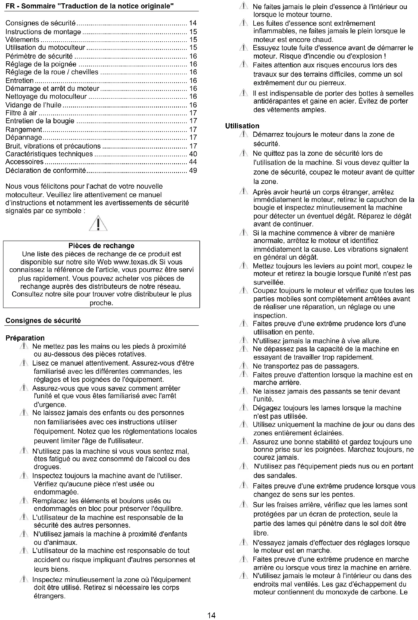 Pièces de rechange Une liste des pièces de rechange de ce produit est disponible sur notre site Web www.texas.dk Si vous connaissez la référence de l’article, vous pourrez être servi plus rapidement. Vous pouvez acheter vos pièces de rechange auprès des distributeurs de notre réseau. Consultez notre site pour trouver votre distributeur le plus proche. Consignes de sécurité Préparation Ne mettez pas les mains ou les pieds à proximité ou au-dessous des pièces rotatives. Lisez ce manuel attentivement. Assurez-vous d'être familiarisé avec les différentes commandes, les réglages et les poignées de l'équipement. Assurez-vous que vous savez comment arrêter l'unité et que vous êtes familiarisé avec l'arrêt d'urgence. Ne laissez jamais des enfants ou des personnes non familiarisées avec ces instructions utiliser l'équipement. Notez que les réglementations locales peuvent limiter l'âge de l'utilisateur. N'utilisez pas la machine si vous vous sentez mal, êtes fatigué ou avez consommé de l'alcool ou des drogues. Inspectez toujours la machine avant de l'utiliser. Vérifiez qu'aucune pièce n'est usée ou endommagée. Remplacez les éléments et boulons usés ou endommagés en bloc pour préserver l'équilibre. L'utilisateur de la machine est responsable de la sécurité des autres personnes. N'utilisez jamais la machine à proximité d'enfants ou d'animaux. L'utilisateur de la machine est responsable de tout accident ou risque impliquant d'autres personnes et leurs biens. Inspectez minutieusement la zone où l'équipement doit être utilisé. Retirez si nécessaire les corps étrangers. Ne faites jamais le plein d'essence à l'intérieur ou lorsque le moteur tourne. Les fuites d'essence sont extrêmement inflammables, ne faites jamais le plein lorsque le moteur est encore chaud. Essuyez toute fuite d'essence avant de démarrer le moteur. Risque d'incendie ou d'explosion ! Faites attention aux risques encourus lors des travaux sur des terrains difficiles, comme un sol extrêmement dur ou pierreux. Il est indispensable de porter des bottes à semelles antidérapantes et gaine en acier. Évitez de porter des vêtements amples. Utilisation Démarrez toujours le moteur dans la zone de sécurité. Ne quittez pas la zone de sécurité lors de l'utilisation de la machine. Si vous devez quitter la zone de sécurité, coupez le moteur avant de quitter la zone. Après avoir heurté un corps étranger, arrêtez immédiatement le moteur, retirez le capuchon de la bougie et inspectez minutieusement la machine pour détecter un éventuel dégât. Réparez le dégât avant de continuer. Si la machine commence à vibrer de manière anormale, arrêtez le moteur et identifiez immédiatement la cause. Les vibrations signalent en général un dégât. Mettez toujours les leviers au point mort, coupez le moteur et retirez la bougie lorsque l'unité n'est pas surveillée. Coupez toujours le moteur et vérifiez que toutes les parties mobiles sont complètement arrêtées avant de réaliser une réparation, un réglage ou une inspection. Faites preuve d'une extrême prudence lors d'une utilisation en pente. N'utilisez jamais la machine à vive allure. Ne dépassez pas la capacité de la machine en essayant de travailler trop rapidement. Ne transportez pas de passagers. Faites preuve d'attention lorsque la machine est en marche arrière. Ne laissez jamais des passants se tenir devant l'unité. Dégagez toujours les lames lorsque la machine n'est pas utilisée. Utilisez uniquement la machine de jour ou dans des zones entièrement éclairées. Assurez une bonne stabilité et gardez toujours une bonne prise sur les poignées. Marchez toujours, ne courez jamais. N'utilisez pas l'équipement pieds nus ou en portant des sandales. Faites preuve d'une extrême prudence lorsque vous changez de sens sur les pentes. Sur les fraises arrière, vérifiez que les lames sont protégées par un écran de protection, seule la partie des lames qui pénètre dans le sol doit être libre. N'essayez jamais d'effectuer des réglages lorsque le moteur est en marche. Faites preuve d'une extrême prudence en marche arrière ou lorsque vous tirez la machine en arrière. N'utilisez jamais le moteur à l'intérieur ou dans des endroits mal ventilés. Les gaz d'échappement du moteur contiennent du monoxyde de carbone. Le15