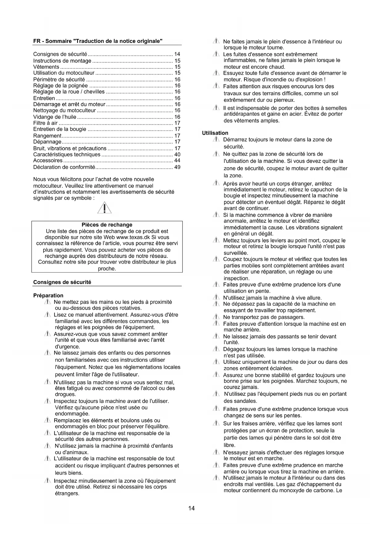 Pièces de rechange Une liste des pièces de rechange de ce produit est disponible sur notre site Web www.texas.dk Si vous connaissez la référence de l’article, vous pourrez être servi plus rapidement. Vous pouvez acheter vos pièces de rechange auprès des distributeurs de notre réseau. Consultez notre site pour trouver votre distributeur le plus proche. Consignes de sécurité Préparation Ne mettez pas les mains ou les pieds à proximité ou au-dessous des pièces rotatives. Lisez ce manuel attentivement. Assurez-vous d'être familiarisé avec les différentes commandes, les réglages et les poignées de l'équipement. Assurez-vous que vous savez comment arrêter l'unité et que vous êtes familiarisé avec l'arrêt d'urgence. Ne laissez jamais des enfants ou des personnes non familiarisées avec ces instructions utiliser l'équipement. Notez que les réglementations locales peuvent limiter l'âge de l'utilisateur. N'utilisez pas la machine si vous vous sentez mal, êtes fatigué ou avez consommé de l'alcool ou des drogues. Inspectez toujours la machine avant de l'utiliser. Vérifiez qu'aucune pièce n'est usée ou endommagée. Remplacez les éléments et boulons usés ou endommagés en bloc pour préserver l'équilibre. L'utilisateur de la machine est responsable de la sécurité des autres personnes. N'utilisez jamais la machine à proximité d'enfants ou d'animaux. L'utilisateur de la machine est responsable de tout accident ou risque impliquant d'autres personnes et leurs biens. Inspectez minutieusement la zone où l'équipement doit être utilisé. Retirez si nécessaire les corps étrangers. Ne faites jamais le plein d'essence à l'intérieur ou lorsque le moteur tourne. Les fuites d'essence sont extrêmement inflammables, ne faites jamais le plein lorsque le moteur est encore chaud. Essuyez toute fuite d'essence avant de démarrer le moteur. Risque d'incendie ou d'explosion ! Faites attention aux risques encourus lors des travaux sur des terrains difficiles, comme un sol extrêmement dur ou pierreux. Il est indispensable de porter des bottes à semelles antidérapantes et gaine en acier. Évitez de porter des vêtements amples. Utilisation Démarrez toujours le moteur dans la zone de sécurité. Ne quittez pas la zone de sécurité lors de l'utilisation de la machine. Si vous devez quitter la zone de sécurité, coupez le moteur avant de quitter la zone. Après avoir heurté un corps étranger, arrêtez immédiatement le moteur, retirez le capuchon de la bougie et inspectez minutieusement la machine pour détecter un éventuel dégât. Réparez le dégât avant de continuer. Si la machine commence à vibrer de manière anormale, arrêtez le moteur et identifiez immédiatement la cause. Les vibrations signalent en général un dégât. Mettez toujours les leviers au point mort, coupez le moteur et retirez la bougie lorsque l'unité n'est pas surveillée. Coupez toujours le moteur et vérifiez que toutes les parties mobiles sont complètement arrêtées avant de réaliser une réparation, un réglage ou une inspection. Faites preuve d'une extrême prudence lors d'une utilisation en pente. N'utilisez jamais la machine à vive allure. Ne dépassez pas la capacité de la machine en essayant de travailler trop rapidement. Ne transportez pas de passagers. Faites preuve d'attention lorsque la machine est en marche arrière. Ne laissez jamais des passants se tenir devant l'unité. Dégagez toujours les lames lorsque la machine n'est pas utilisée. Utilisez uniquement la machine de jour ou dans des zones entièrement éclairées. Assurez une bonne stabilité et gardez toujours une bonne prise sur les poignées. Marchez toujours, ne courez jamais. N'utilisez pas l'équipement pieds nus ou en portant des sandales. Faites preuve d'une extrême prudence lorsque vous changez de sens sur les pentes. Sur les fraises arrière, vérifiez que les lames sont protégées par un écran de protection, seule la partie des lames qui pénètre dans le sol doit être libre. N'essayez jamais d'effectuer des réglages lorsque le moteur est en marche. Faites preuve d'une extrême prudence en marche arrière ou lorsque vous tirez la machine en arrière. N'utilisez jamais le moteur à l'intérieur ou dans des endroits mal ventilés. Les gaz d'échappement du moteur contiennent du monoxyde de carbone. Le15