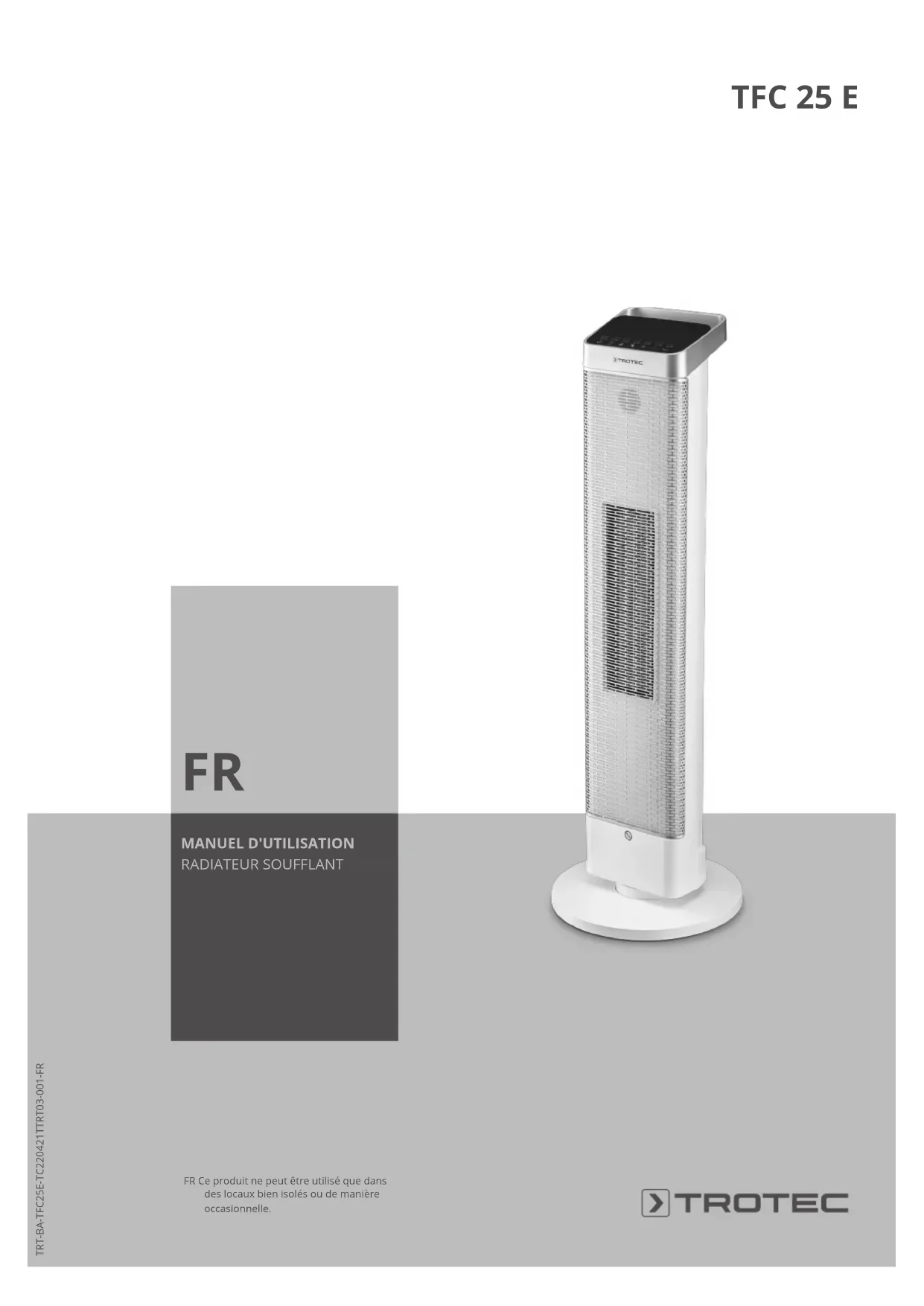 - MANUEL D'UTILISATION RADIATEUR SOUFFLANT FR Ce produit ne peut être utilisé que dans des locaux bien isolés ou de manière occasionnelle.2 FR radiateur soufflant TFC 25 E Sommaire Indications sur le manuel d'utilisation p. 2