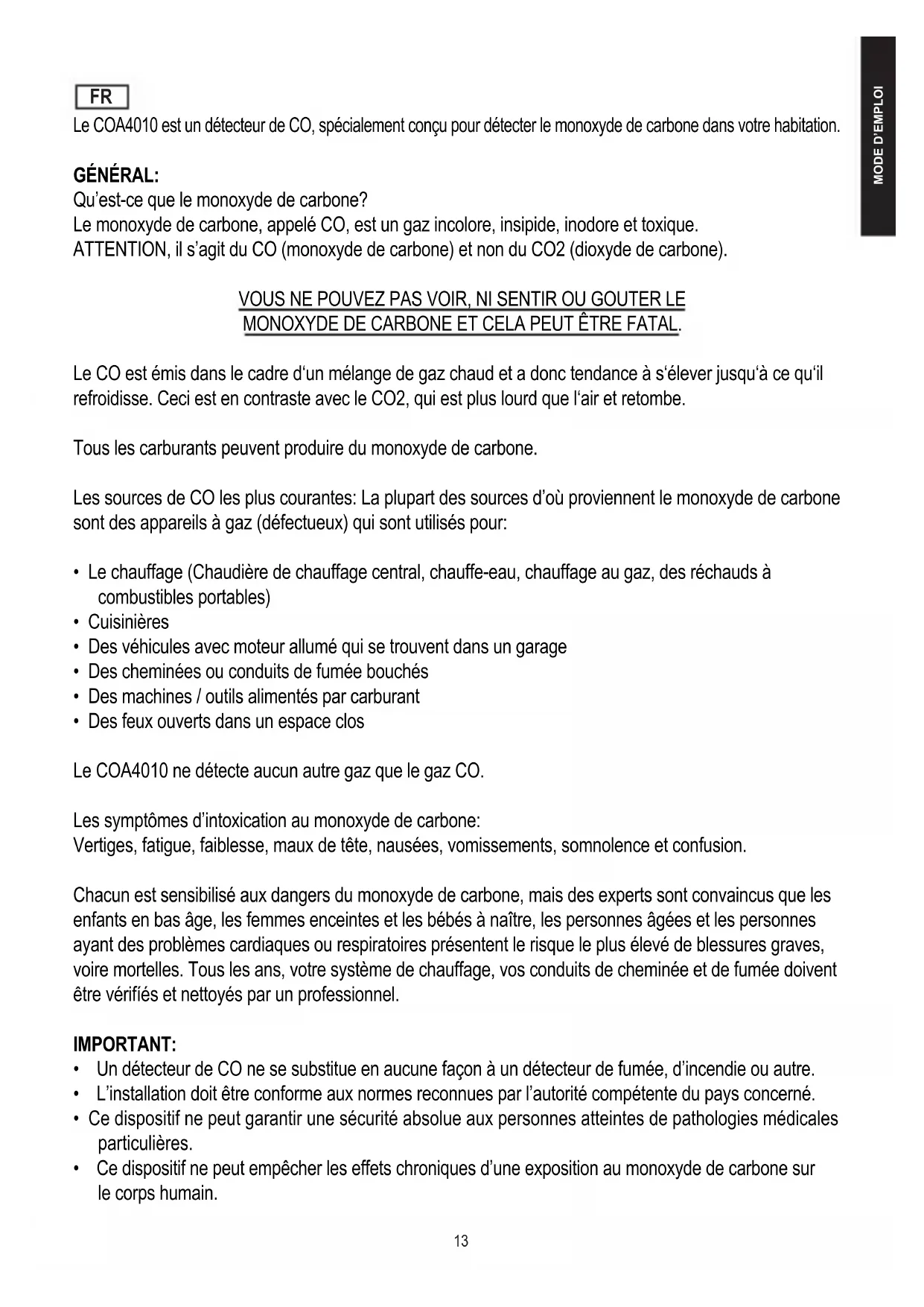 - Des feux ouverts dans un espace clos Le COA4010 ne détecte aucun autre gaz que le gaz CO. Les symptômes d’intoxication au monoxyde de carbone: Vertiges, fatigue, faiblesse, maux de tête, nausées, vomissements, somnolence et confusion. Chacun est sensibilisé aux dangers du monoxyde de carbone, mais des experts sont convaincus que les enfants en bas âge, les femmes enceintes et les bébés à naître, les personnes âgées et les personnes ayant des problèmes cardiaques ou respiratoires présentent le risque le plus élevé de blessures graves, voire mortelles. Tous les ans, votre système de chauffage, vos conduits de cheminée et de fumée doivent être vérifíés et nettoyés par un professionnel. IMPORTANT: