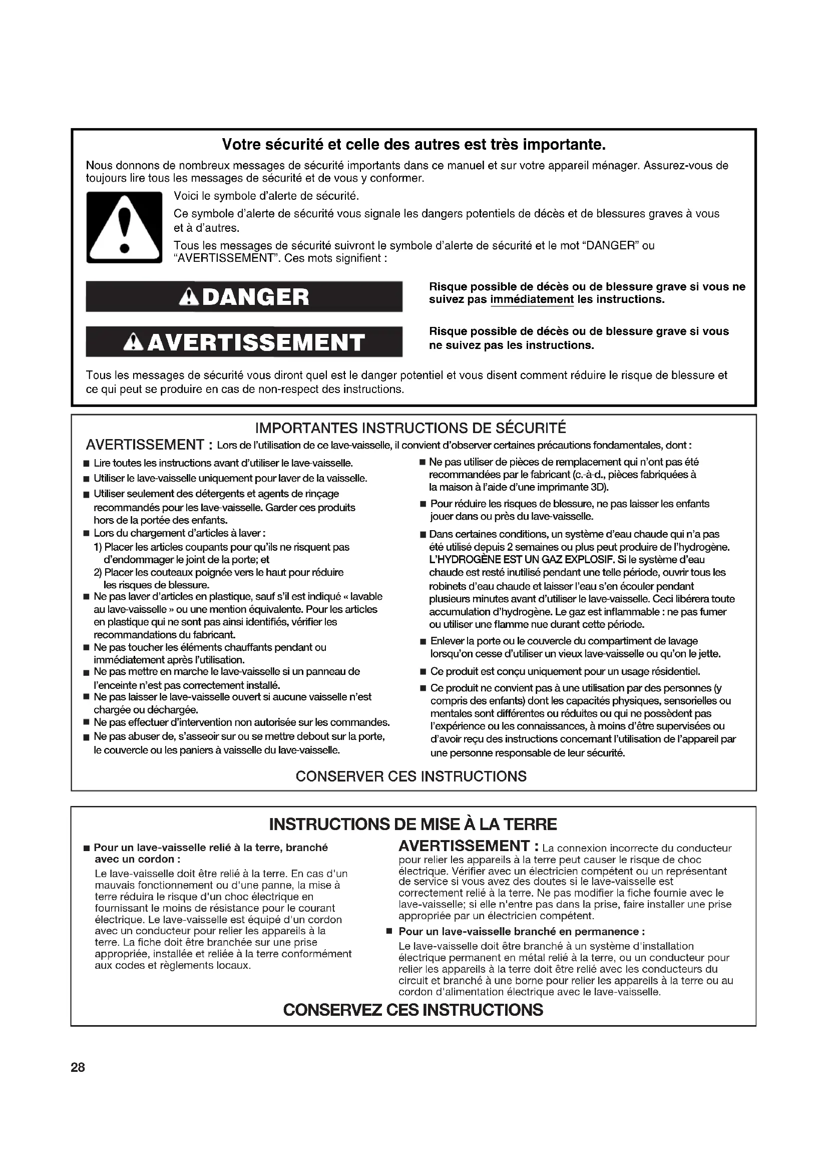 Risque possible de décès ou de blessure grave si vous ne suivez pas immédiatement les instructions. Risque possible de décès ou de blessure grave si vous ne suivez pas les instructions. Tous les messages de sécurité vous diront quel est le danger potentiel et vous disent comment réduire le risque de blessure et ce qui peut se produire en cas de non-respect des instructions. Votre sécurité et celle des autres est très importante. Nous donnons de nombreux messages de sécurité importants dans ce manuel et sur votre appareil ménager. Assurez-vous de toujours lire tous les messages de sécurité et de vous y conformer. AVERTISSEMENT DANGER Voici le symbole d’alerte de sécurité.Ce symbole d’alerte de sécurité vous signale les dangers potentiels de décès et de blessures graves à vous et à d’autres.Tous les messages de sécurité suivront le symbole d’alerte de sécurité et le mot “DANGER” ou “AVERTISSEMENT”. Ces mots signifient : CONSERVERCESINSTRUCTIONS IMPORTANTESINSTRUCTIONSDESÉCURITÉ