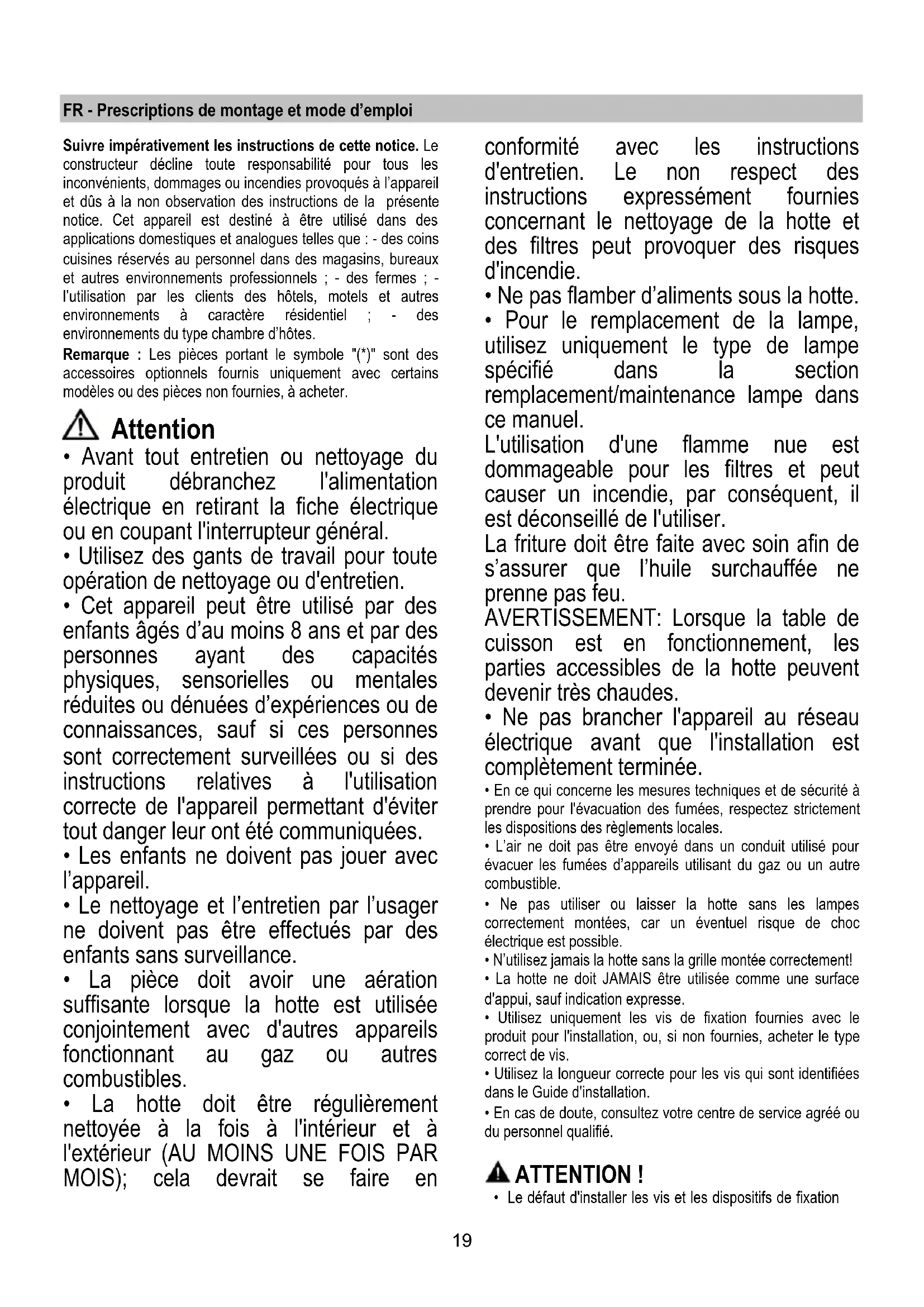 - La hotte doit être régulièrement nettoyée à la fois à l'intérieur et à l'extérieur (AU MOINS UNE FOIS PAR MOIS); cela devrait se faire en conformité avec les instructions d'entretien. Le non respect des instructions expressément fournies concernant le nettoyage de la hotte et des filtres peut provoquer des risques d'incendie.