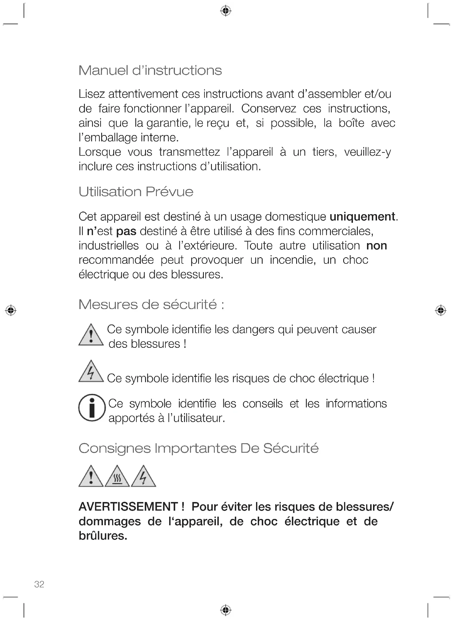La température des surfaces accessibles peut être élevée pendant le fonctionnement. Par conséquent, ne touchez pas l’appareil pendant et/ou immédiatement après son fonctionnement. Ne laissez jamais l’appareil sans surveillance pendant l’utilisation. Sécurité anti-surchauffe L’appareil dispose d’une sécurité thermique. En cas de panne du thermostat (surchauffe), le circuit électrique dispose d’une coupure automatique, évitant ainsi la surchauffe. Si cela se produit, débranchez l’appareil de la prise secteur.FRANÇAIS Manuel d‘instructions