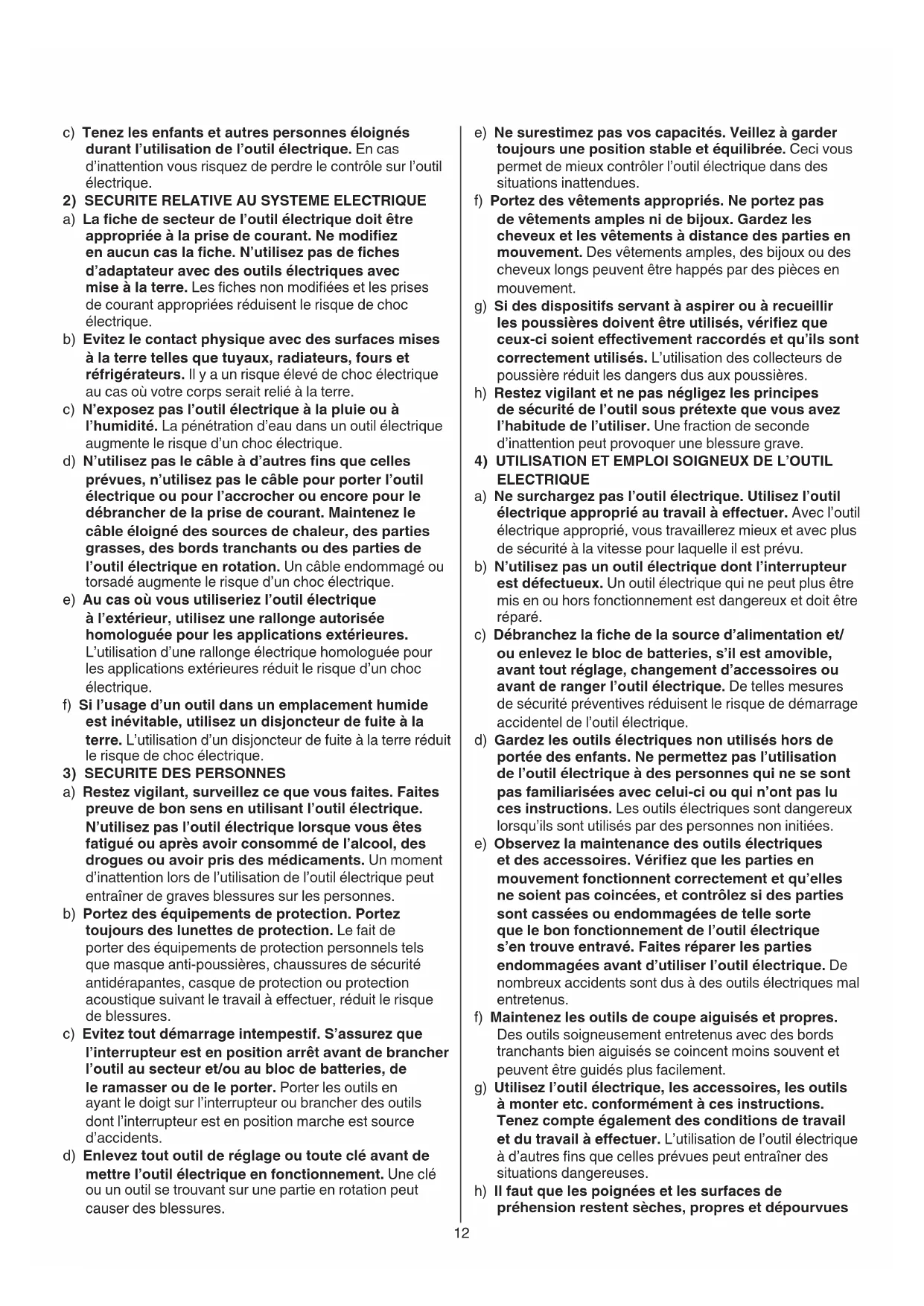 a) Restez vigilant, surveillez ce que vous faites. Faites preuve de bon sens en utilisant l’outil électrique. N’utilisez pas l’outil électrique lorsque vous êtes fatigué ou après avoir consommé de l’alcool, des drogues ou avoir pris des médicaments. Un moment d’inattention lors de l’utilisation de l’outil électrique peut entraîner de graves blessures sur les personnes. b) Portez des équipements de protection. Portez toujours des lunettes de protection. Le fait de porter des équipements de protection personnels tels que masque anti-poussières, chaussures de sécurité antidérapantes, casque de protection ou protection acoustique suivant le travail à eectuer, réduit le risque de blessures. c) Evitez tout démarrage intempestif. S’assurez que l’interrupteur est en position arrêt avant de brancher l’outil au secteur et/ou au bloc de batteries, de le ramasser ou de le porter. Porter les outils en ayant le doigt sur l’interrupteur ou brancher des outils dont l’interrupteur est en position marche est source d’accidents. d) Enlevez tout outil de réglage ou toute clé avant de mettre l’outil électrique en fonctionnement. Une clé ou un outil se trouvant sur une partie en rotation peut causer des blessures.13 ainsi que les personnes se trouvant à proximité et laisser tourner l’outil électroportatif à la vitesse maximale pendant une minute. Dans la plupart des cas, les accessoires endommagés cassent pendant ce temps d’essai. h) Porter des équipements de protection personnels. Selon l’utilisation, porter une protection complète pour le visage, une protection oculaire ou des lunettes de protection. Si nécessaire, porter un masque anti-poussière, une protection acoustique, des gants de protection ou un tablier spécial qui vous protège de petites particules de matériau causées par le meulage. Protéger vos yeux de corps étrangers projetés dans l’air lors des diérentes utilisations. Les masques anti-poussière ou les masques respiratoires doivent ltrer la poussière générée lors de l’utilisation. Une exposition trop longue au bruit fort peut entraîner une perte d’audition.