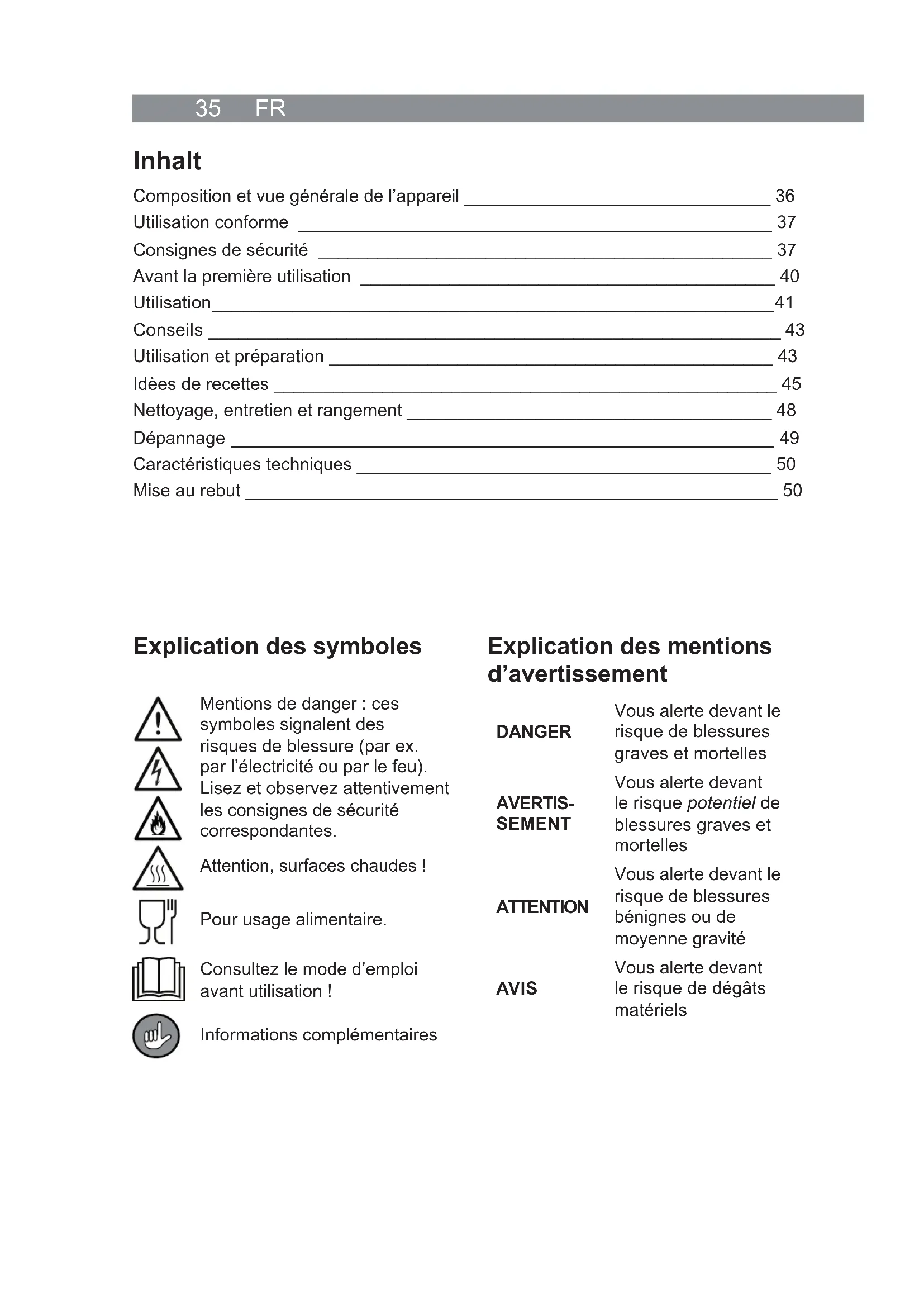 nes de sécurité, des instructions, des illustrations et des caractéristiques techniques dont est doté cet appareil. Tout manquement aux consignes de sécurité et aux instruc- tions données peut provoquer une décharge électrique, un incendie et/ou des blessures. ■ Cet appareil peut être utilisé par les enfants à partir de 8 ans et les personnes dont les capacités physiques, sensorielles ou mentales sont réduites ou qui manquent d’expérience et/ou de connaissances lorsqu‘elles sont sous surveillance ou qu’elles ont été instruites quant à l‘utilisation de l‘appareil en toute sécu- rité et qu‘elles ont compris les risques en découlant. ■ Les enfants ne doivent pas jouer avec cet appareil. ■ Le nettoyage et l’entretien utilisateur ne doivent pas être réa- lisés par les enfants sauf s‘ils ont plus de 8 ans et qu‘ils sont sous surveillance. ■ Tenez l‘appareil et son cordon d‘alimentation hors de portée des animaux et des enfants de moins de 8 ans. ATTENTION : surfaces chaudes ! À l‘utilisation, l‘appareil devient très chaud. Prenez soin de ne pas entrer en contact avec les parties chauffées pen- dant et après l‘utilisation de l‘appareil. Lorsque l‘appareilFR 38 fonctionne ou immédiatement après l‘avoir arrêté, seuls la poignée et le panneau de commande peuvent être saisis. ■ Ne plongez jamais le corps de l’appareil ni le cordon de raccor- dement dans l‘eau ou tout autre liquide et assurez-vous qu‘ils ne risquent pas de tomber dans l‘eau ou d‘être mouillés. Risque d‘électrocution au contact de l’eau ! ■ Ne versez aucun liquide (par ex. huile ou eau) directement dans l‘appareil ou dans le tiroir, et ne placez aucun récipient rempli de liquide dans l’appareil. Il fonctionne exclusivement à chaleur tournante. ■ L‘appareil doit toujours être débranché du secteur lorsqu‘il n‘est pas sous surveillance, avant d‘être rempli, vidé ou nettoyé. ■ L‘appareil n‘est pas conçu pour une utilisation avec une minute- rie externe ou un système de commande à distance séparé. ■ Pour la propre sécurité de l’utilisateur, l‘appareil et le cordon de raccordement doivent être contrôlés avant chaque mise en mar- che afi n de s’assurer qu‘ils ne présentent aucun endommage- ment. Utilisez l‘appareil uniquement s‘il est entièrement foncti- onnel. ■ Ne procédez à aucune modifi cation sur l‘appareil. De même, ne remplacez pas le cordon de raccordement vous-même. En cas d‘endommagement de l‘appareil lui-même ou de son cordon de raccordement, c‘est au fabricant, au service après-vente ou à un atelier spécialisé qu‘il revient de les remplacer afi n d‘éviter tout danger. ■ Il est essentiel d’observer les consignes données au paragraphe « Nettoyage, entretien et rangement ». DANGER – Risque d‘électrocution ■ Utilisez et entreposez l‘appareil uniquement dans des pièces fermées. N’utilisez pas l’appareil dans des pièces à fort taux d‘humidité. ■ Si le corps de l’appareil devait tomber à l‘eau, coupez immédiatement l‘alimentation électrique. N‘essayez pas d‘extraire l‘appareil de l‘eau tant qu‘il est encore raccordé au réseau électrique ! Faites vérifi er l‘appareil dans un atelier spécialisé avant de le remettre en marche. ■ Ne saisissez jamais l‘appareil ni le cordon de raccordement à mains humides lorsque ces composants sont raccordés au réseau électrique. ■ Veillez à ce que la vapeur qui se dégage ne puisse pas aller tout droit vers des appareils électriques ou des installations comportant des composants électriques.39 FR AVERTISSEMENT – Risque de blessures ■ Ne laissez pas les sacs et fi lms en plastique à la portée des enfants ou des animaux. Risque de suffocation ! ■ Assurez-vous de toujours tenir le cordon d‘alimentation hors de portée des jeunes enfants et des animaux. Risque de strangulation ! ■ Risque de brûlure par la chaleur, le dégagement de vapeur très chaude ou d‘eau de condensation ! ■ De la vapeur chaude peut s‘échapper de l‘appareil en cours de fonctionnement ainsi qu‘à l‘extraction du tiroir. Tenez de ce fait vos mains et votre tête éloignées de la zone de danger (par ex. des fentes d‘aération au dos de l‘appareil). Nous recommandons par ailleurs l‘emploi de maniques ou de gants de cuisine pour l’extraction du tiroir. ■ Les aliments préparés sont chauds. Faites preuve de prudence lorsque vous manipulez des denrées brûlantes. ■ Afi n que personne ne risque de trébucher, veillez à ce que le cordon d‘alimentation branché ne gêne pas le passage. Le cordon d‘alimentation ne doit pas pendre de la surface d‘appui pour ne pas risquer d‘entraîner l‘appareil et de le faire tomber. AVERTISSEMENT – Risque d‘incendie ■ N‘utilisez pas l‘appareil dans des locaux renfermant des substances facilement in- fl ammables ou des vapeurs nocives ou explosives. ■ N‘utilisez pas l‘appareil à proximité de matériaux combustibles. Ne mettez pas de matières infl ammables (par ex. du carton, du papier, du bois ou du plastique) à l‘intérieur de l‘appareil, et n’en posez pas non plus dessus. ■ Ne branchez pas l‘appareil avec d‘autres consommateurs (puissants) sur une multi- prise afi n d‘éviter toute surcharge, voire un court-circuit (incendie). ■ N’utilisez pas de rallonge. ■ N‘introduisez aucun objet dans les orifi ces d‘aération de l‘appareil et assurez-vous que ces derniers ne sont pas obstrués. ■ Veillez à ce que les aliments riches en huile et en graisse ne soient pas surchauffés. ■ Afi n d‘éviter tout risque d‘incendie de l‘appareil, ne le couvrez pas lorsqu‘il est en cours de fonctionnement. ■ En cas d‘incendie : n‘éteignez pas avec de l‘eau ! Étouffez les fl ammes à l‘aide d‘une couverture ignifuge ou d‘un extincteur approprié. AVIS – Pour éviter to