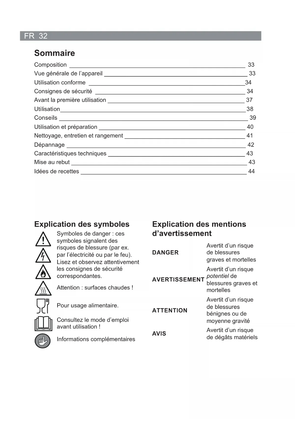 press down the edge of the pastry.FR 32 Sommaire Composition ______________________________________________________ 33 Vue générale de l’appareil ____________________________________________ 33 Utilisation conforme ________________________________________________34 Consignes de sécurité ______________________________________________ 34 Avant la première utilisation __________________________________________ 37 Uti lisati on _________________________________________________________ 3 8 Conseils __________________________________________________________ 39 Utilisation et préparation _____________________________________________ 40 Nettoyage, entretien et rangement _____________________________________ 41 Dépannage _______________________________________________________ 42 Caractéristiques techniques __________________________________________ 43 Mise au rebut ______________________________________________________ 43 Idées de recettes ___________________________________________________ 44 Explication des symboles Symboles de danger : ces symboles signalent des risques de blessure (par ex. par l’électricité ou par le feu). Lisez et observez attentivement les consignes de sécurité correspondantes. Attention : surfaces chaudes ! Pour usage alimentaire. Consultez le mode d’emploi avant utilisation ! Informations complémentaires Explication des mentions d’avertissement DANGER Avertit d’un risque de blessures graves et mortelles AVERTISSEMENT Avertit d’un risque potentiel de blessures graves et mortelles ATTENTION Avertit d’un risque de blessures bénignes ou de moyenne gravité AVIS Avertit d’un risque de dégâts matériels33 FR Chère cliente, cher client, Nous vous félicitons d’avoir fait l’acquisition de notre friteuse à chaleur tournante. Veuillez lire attentivement le présent mode d’emploi avant la première utilisation de l’appareil et le conserver précieusement pour toute consultation ultérieure. Si vous donnez ou prêtez cet appareil à une tierce personne, n’oubliez pas d’y joindre ce mode d’emploi. Il fait partie intégrante de l’appareil. Le fabricant et l’importateur déclinent toute responsabilité en cas de non-observation des instructions consignées dans le mode d’emploi. À observer : les illustrations de ce mode d’emploi peuvent présenter de légères divergences avec l’appareil concerné. Pour toute question concernant cet appareil et ses pièces de rechange et acces- soires, veuillez contacter le service après-vente à partir de notre site Internet : www.dspro.de/kundenservice Composition