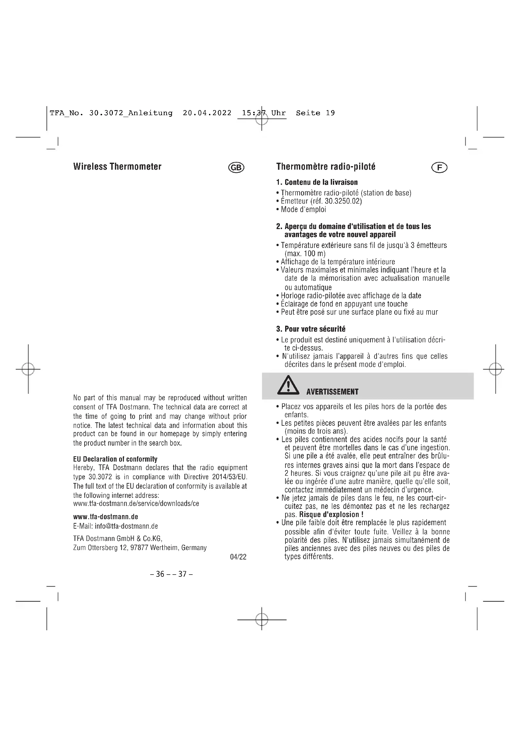 - Une pile faible doit être remplacée le plus rapidement possible afin d'éviter toute fuite. Veillez à la bonne polarité des piles. N'utilisez jamais simultanément de piles anciennes avec des piles neuves ou des piles de types différents. TFA_No. 30.3072_Anleitung 20.04.2022 15:37 Uhr Seite 19– 38 – – 39 – Thermomètre radio-piloté