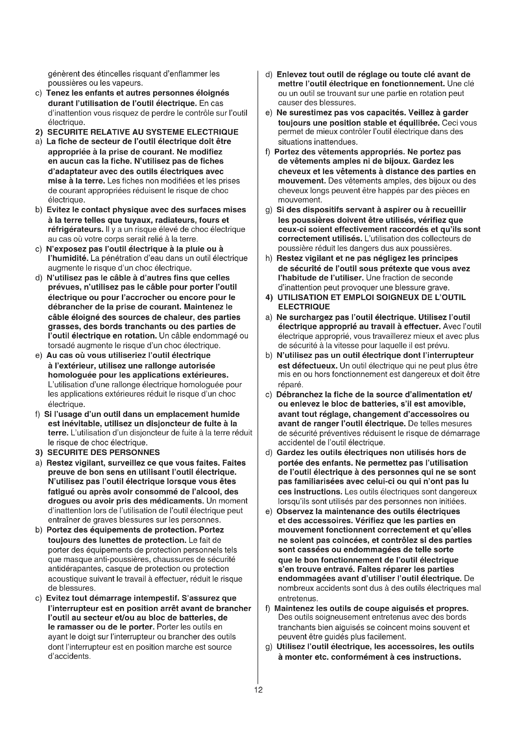 a) Restez vigilant, surveillez ce que vous faites. Faites preuve de bon sens en utilisant l’outil électrique. N’utilisez pas l’outil électrique lorsque vous êtes fatigué ou après avoir consommé de l’alcool, des drogues ou avoir pris des médicaments. Un moment d’inattention lors de l’utilisation de l’outil électrique peut entraîner de graves blessures sur les personnes. b) Portez des équipements de protection. Portez toujours des lunettes de protection. Le fait de porter des équipements de protection personnels tels que masque anti-poussières, chaussures de sécurité antidérapantes, casque de protection ou protection acoustique suivant le travail à eectuer, réduit le risque de blessures. c) Evitez tout démarrage intempestif. S’assurez que l’interrupteur est en position arrêt avant de brancher l’outil au secteur et/ou au bloc de batteries, de le ramasser ou de le porter. Porter les outils en ayant le doigt sur l’interrupteur ou brancher des outils dont l’interrupteur est en position marche est source d’accidents.13