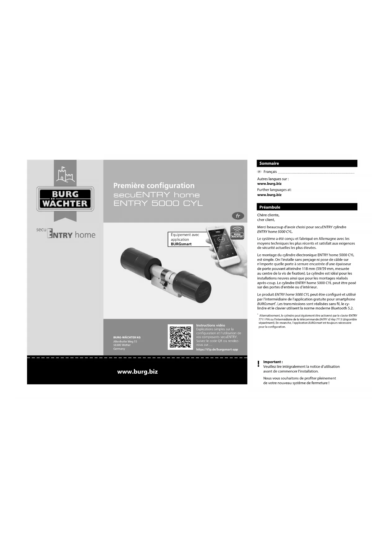 Préambule Chère cliente, cher client,Merci beaucoup d’avoir choisi pour secuENTRY cylindre ENTRYhome 5000CYL.Le système a été conçu et fabriqué en Allemagne avec les moyens techniques les plus récents et satisfait aux exigences de sécurité actuelles les plus élevées. Le montage du cylindre électronique ENTRYhome 5000CYL est simple. On l’installe sans perçage ni pose de câble sur n’importe quelle porte àserrure encastrée d’une épaisseur de porte pouvant atteindre 118mm (59/59mm, mesurée au centre de la vis de xation). Le cylindre est idéal pour les installations neuves ainsi que pour les montages réalisés après-coup. Le cylindre ENTRYhome5000CYL peut être posé sur des portes d’entrée ou d’intérieur. Le produit ENTRYhome5000CYLpeut être conguré et utilisé par l’intermédiaire de l’application gratuite pour smartphone BURGsmart . Les transmissions sont réalisées sans l, le cy-lindre et le clavier utilisent la norme moderne Bluetooth5.2. Alternativement, le cylindre peut également être actionné par le clavier ENTRY 7711 PIN ou l’intermédiaire de la télécommande ENTRYsE-Key7713 (disponible séparément). En revanche, l’application BURGsmart est toujours nécessaire pour la conguration.Équipement avec applicationBURGsmartInstructions vidéo Explications simples sur la conguration et l’utilisation de vos composants secuENTRY. Suivez le codeQR ou rendez-vous sur....https://t1p.de/burgsmart-app Français 2Autres langues sur:www.burg.bizFurther languages at: www.burg.biz secuENTRY home ENTRY 5000 CYL2 I Français ENTRY home 5000 CYL Contenu du kit