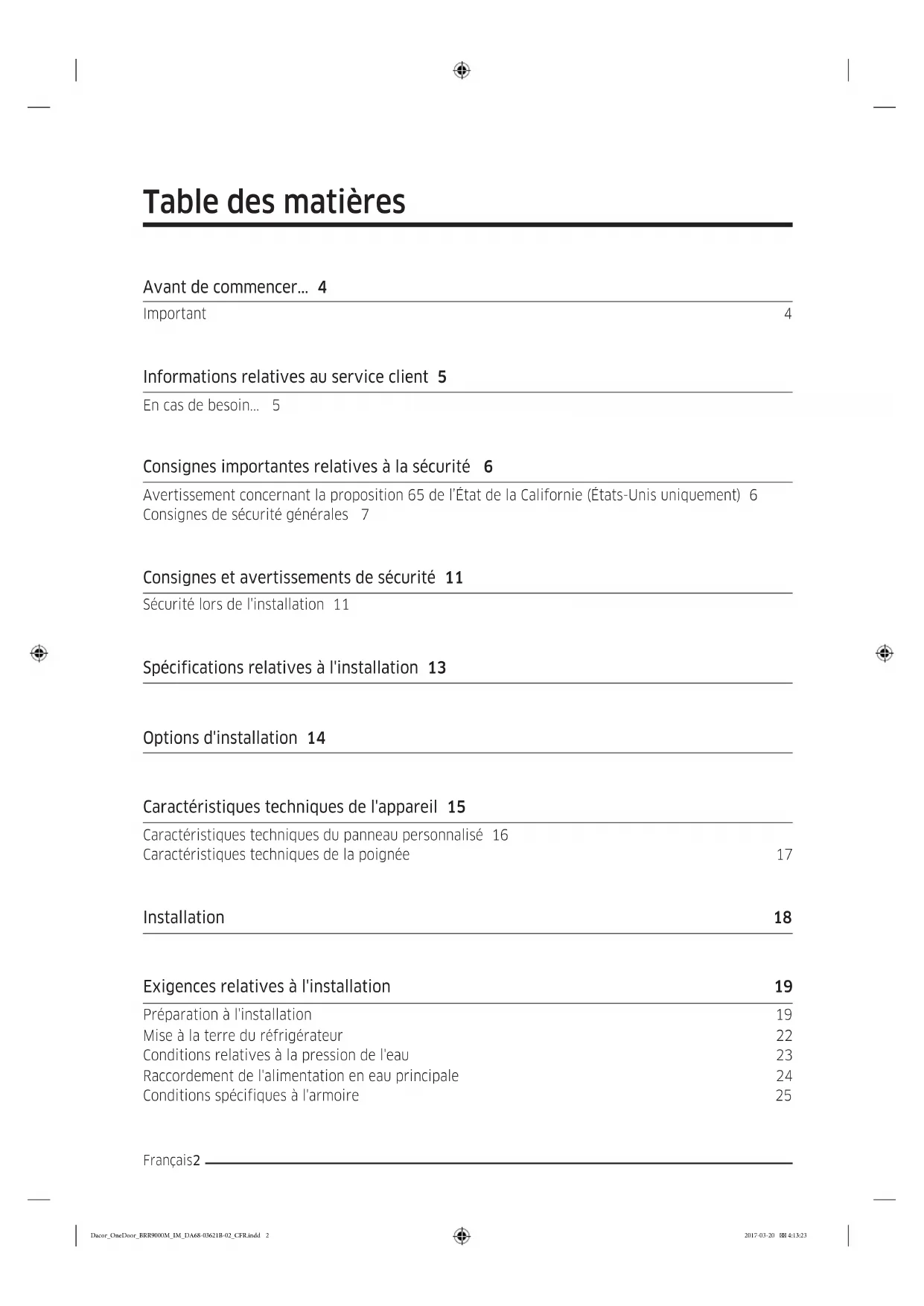 - Ne retirez pas les grilles afin que les enfants ne puissent pas facilement monter dans le réfrigérateur. Dacor_OneDoor_BRR9000M_IM_DA68-03621B-02_CFR.indd 7 2017-03-20 4:13:24CONSERVEZ CES INSTRUCTIONS Consignes importantes relatives à la sécurité Français8