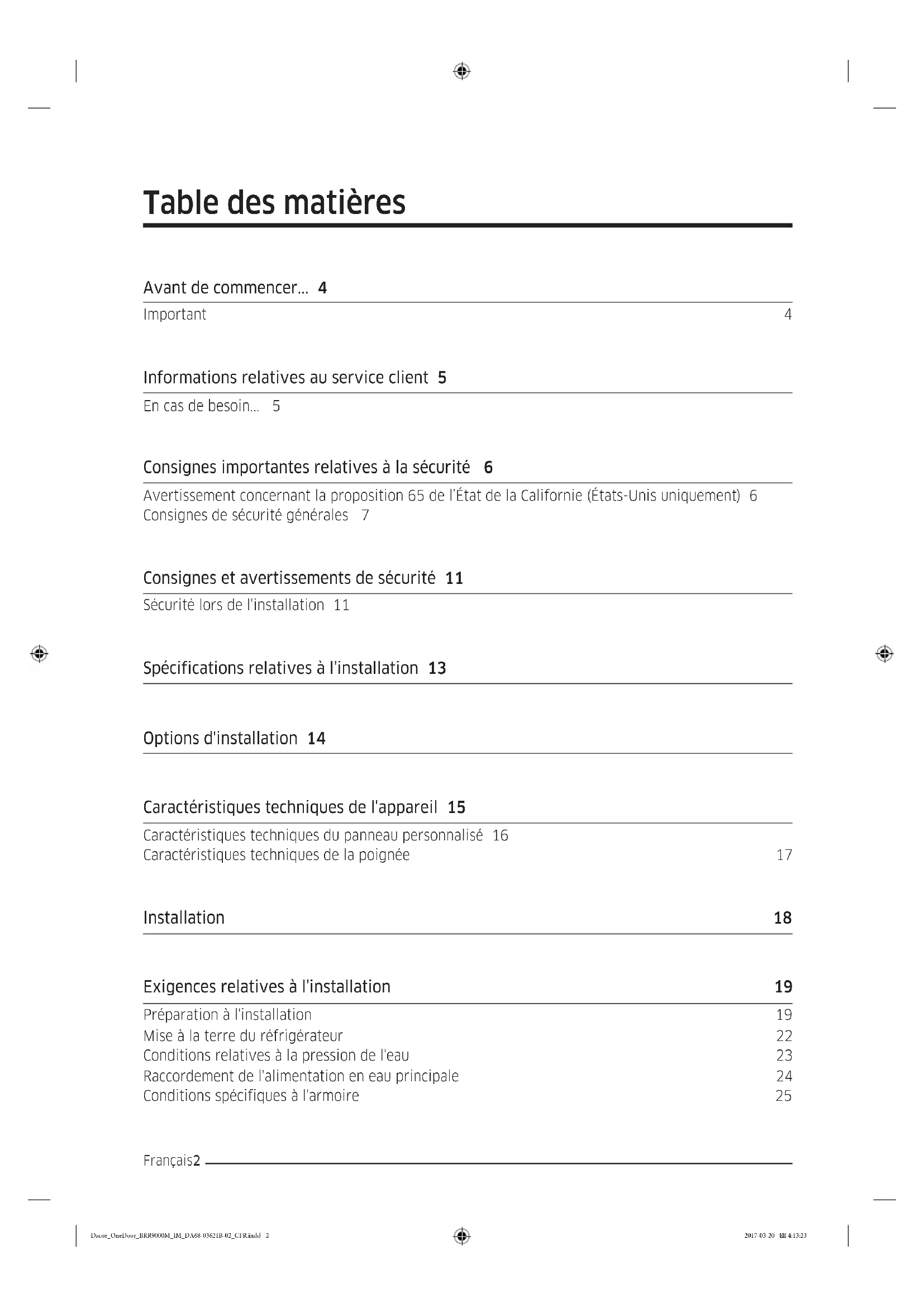 - Ne retirez pas les grilles afin que les enfants ne puissent pas facilement monter dans le réfrigérateur. Dacor_OneDoor_BRR9000M_IM_DA68-03621B-02_CFR.indd 7 2017-03-20 4:13:24CONSERVEZ CES INSTRUCTIONS Consignes importantes relatives à la sécurité Français8