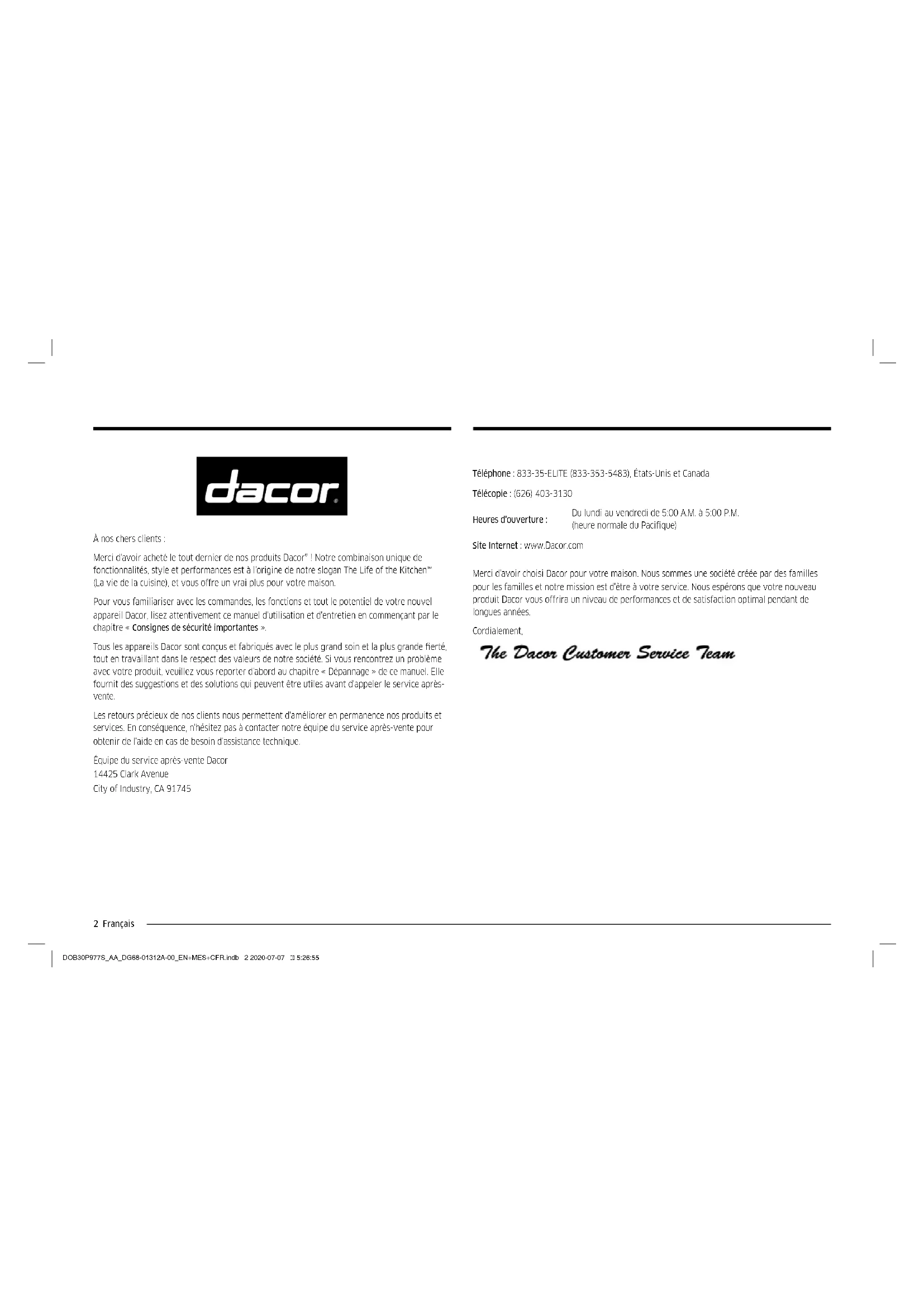 Oui Non Remarques :Merci beaucoup pour votre contribution. Les informations que vous nous avez fournies nous aideront pour les projets à venir et à vous apporter l'assistance que vous méritez. Placez l'étiquette portant le numéro de série ici Site Web : www.Dacor.com Téléphone : 833-35-ELITE (833-353-5483) DOB30P977S_AA_DG68-01312A-00_EN+MES+CFR.indb 59 2020-07-07 5:27:29Dacor ∙ 14425 Clark Avenue, City of Industry, CA 91745 ∙ Téléphone : 833-35-ELITE (833-353-5483) ∙ Télécopie : (626) 403-3130 ∙ www.dacor.com DG68-01312A-00 DOB30P977S_AA_DG68-01312A-00_EN+MES+CFR.indb 60 2020-07-07 5:27:29